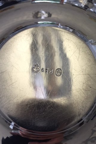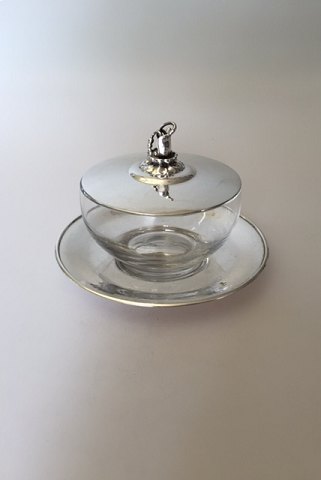 Georg Jensen Sterling Silver and Glass Caviar Bowl with lid and tray No 610. Tray measures 15,8cm, lid 11cm and 10,5cm high.