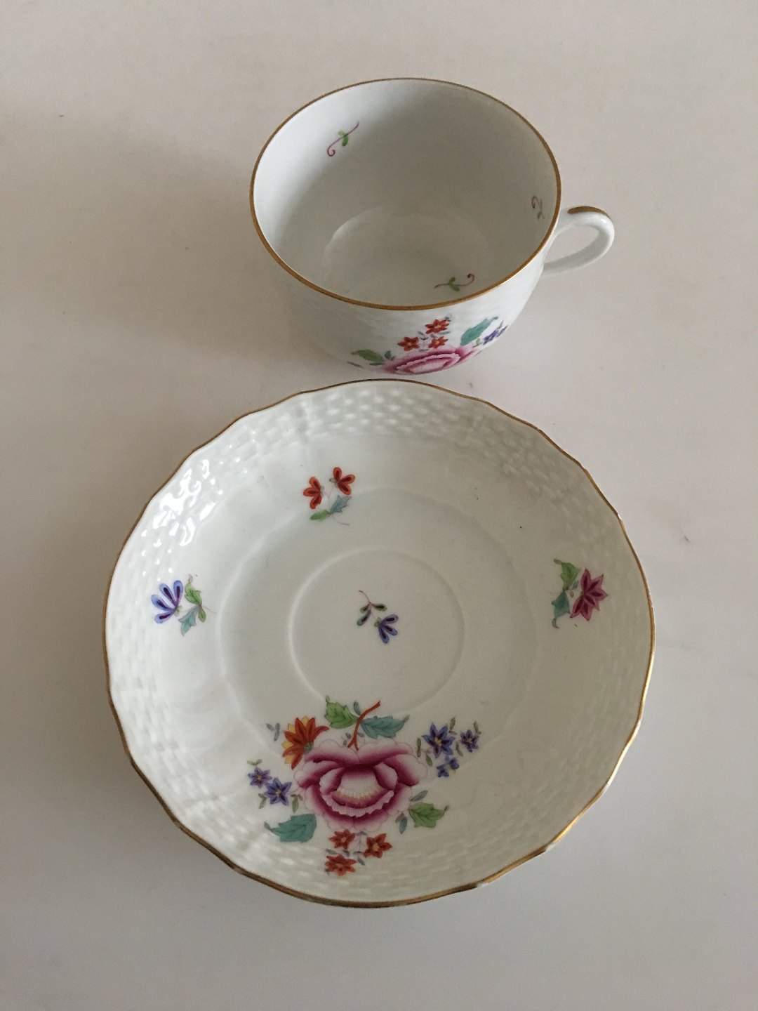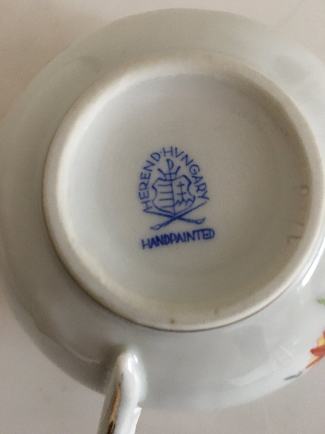 Herend Hugary Tea Cup and Saucer with handpainted flowers . Measures 8.7cm. Slight wear on gold rim.