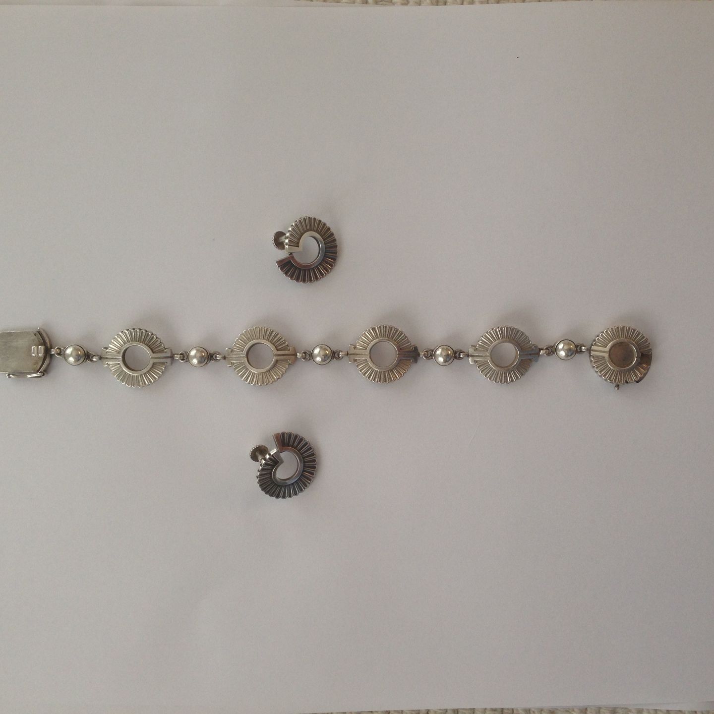 Georg Jensen Sterling Silver Art Deco Jewelry Set Bracelet and Earscrews No 101 and No 97. Measures 19cm and 2,2cm. Weighs 32g / 1,14oz, 8,7g /0,30oz