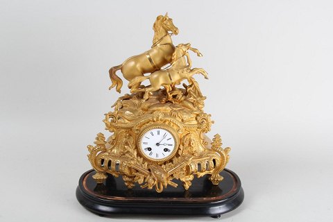 Antique French Mantel Clock of Bronze with Horses, weapons and leafs Marked P. Mourey. Comes with glas cover. Measures 43cm x 36cm.