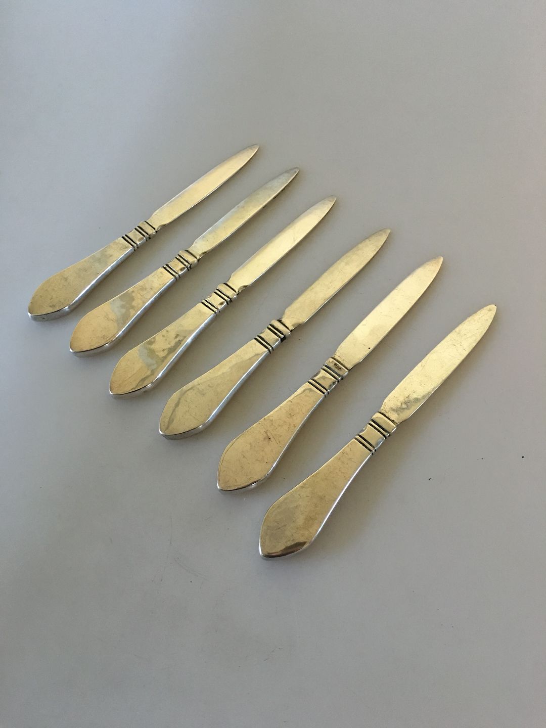 6 x Georg Jensen Continental Silver 830 S Fruit knifes No 12 with very early marks. From the time around when they were designed. Measures 15 cm / 5 29/32" and all have sign of use.