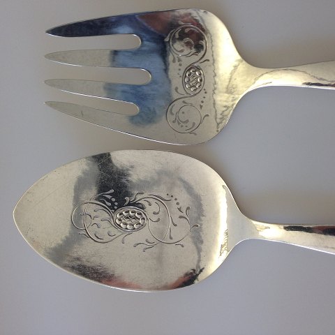 Georg Jensen Dahlia Sterling Silver Fish Serving Set. Designed by Siegfried Wagner. Measures 24.5 cm / 9 5/8 in. and 26.5 cm / 10 7/16 in. From 1926.