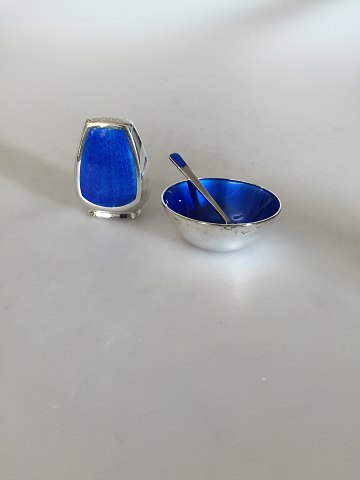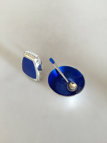 Anton Michelsen Salt & Pepper set in Sterling Silver with blue enamel. The peppershakers height is 5 cm (1 31/32"). Diameter of the saltbowl measures 5 cm (1 31/32"). Combined weight is 48 g (1,70 oz). In good condition.