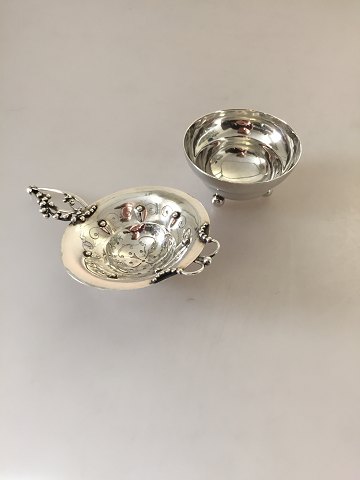 Georg Jensen Teastrainer and holder in silver No 77. Strainer without number, but from 1908-1914. Holder with nummer No 77 and from 1921. Measures 4 cm high (1 37/64"), 8 cm in diameter (3 5/32"), 14 cm long (5 33/64"). Weighs 84 g / 2.95 oz