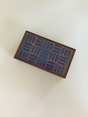 Wooden Palisander Box with Ceramic Enamel Lid in Shades of Blue. The ceramic lid has a small chip in one corner.