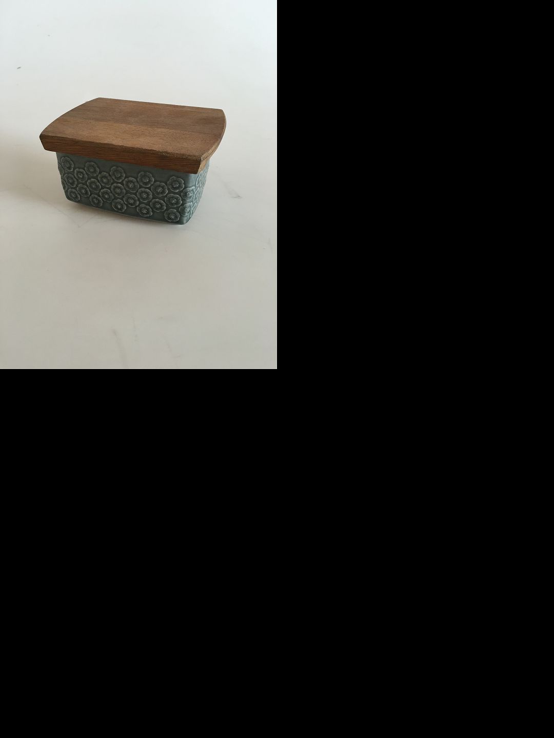 Bing & Grondahl Kronjyden Green Azur Butter Box with Wooden Lid. Measures 11 cm / 4 21/64 in. x 8 cm / 3 5/32 in. x 6 cm / 2 23/64 in.