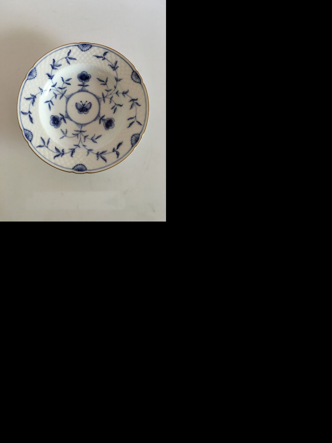 Bing & Grondahl Butterfly with Gold Deep Plate. Measures 21 cm (8 17/64"). The plates are in good condition, but the gold around the border can have some wear to it. Very early with the Hoveddepot mark.