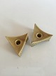 Bing and Grøndahl Jens Quistgaard Triangular Pair of Candlesticks from the Relief Series. Ceramic Stoneware (Kronjyden). Measures 5.5 cm / 2 11/64 in. x 9.5 cm / 3 47/64 in.