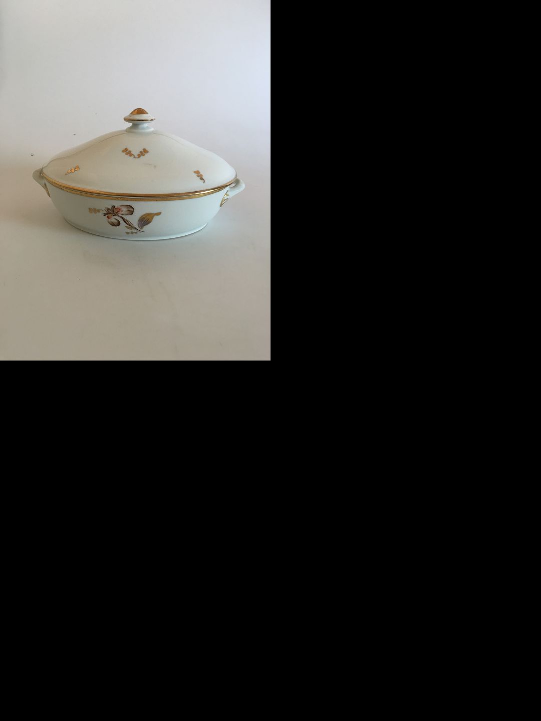 Royal Copenhagen Brown Iris Oval Bowl with Lid No 9348. 23.5 x 18 cm. The gold at the top handle is a bit worn.