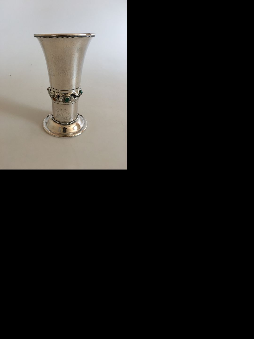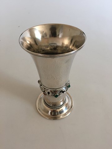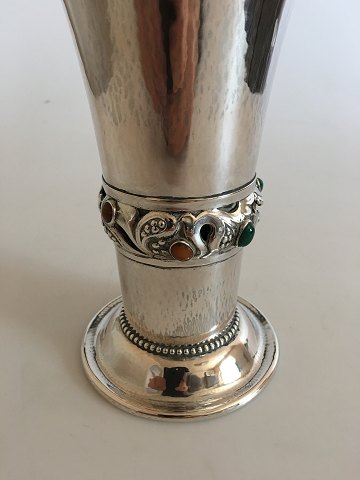 Georg Jensen 830 Silver Vase No 132 in the Danish Art Noveau Style. Ornamented with Amber and Green Agate
