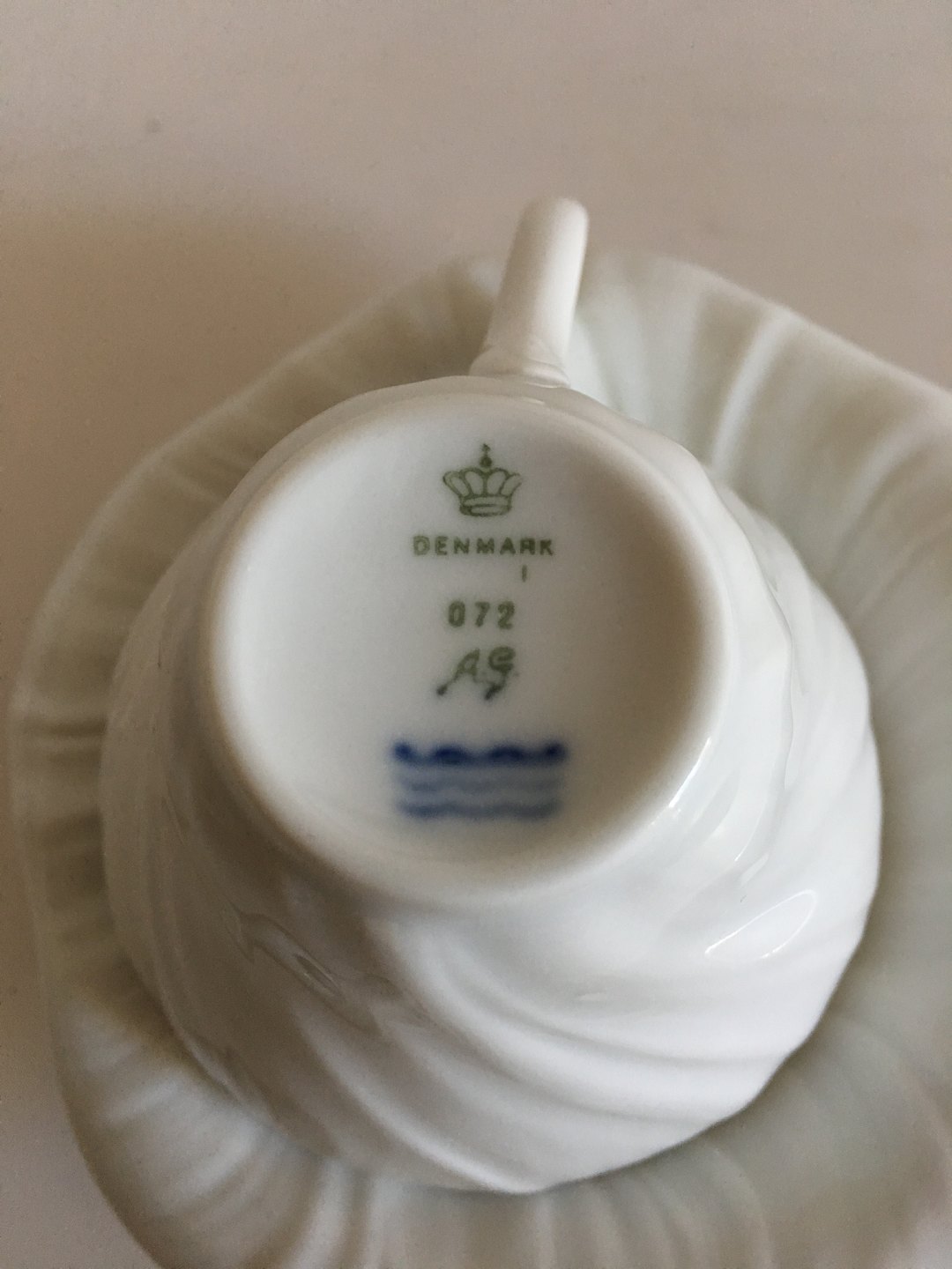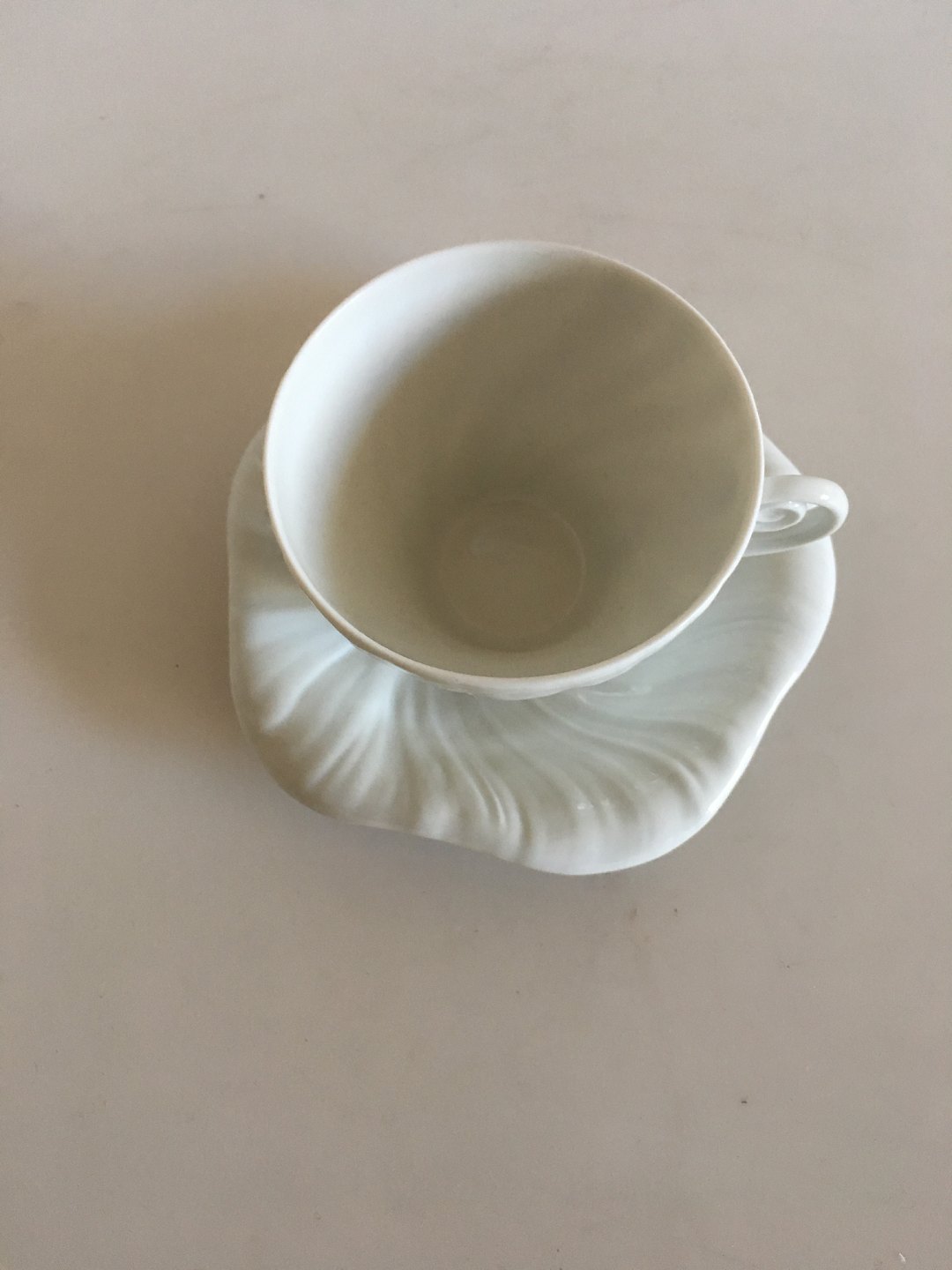 Royal Copenhagen White Triton Mocca Cup and Saucer14179(072/073). Cup measures 5.5 cm H (2 11/64"). 7.5 cm dia (2 61/64"). In perfect condition. Designed by Arje Griegst