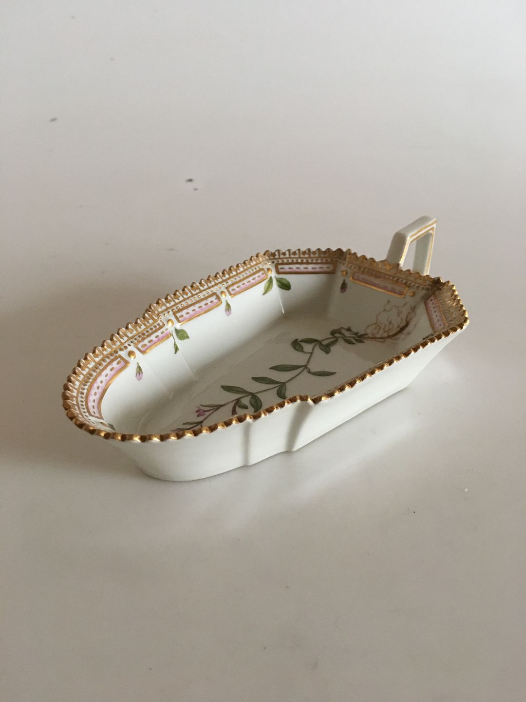 Flora Danica Pickle Dish with Handle No 20/3543. Latin Name: Epilobium Alpinum 15 cm L (5 29/32"). In perfect condition.