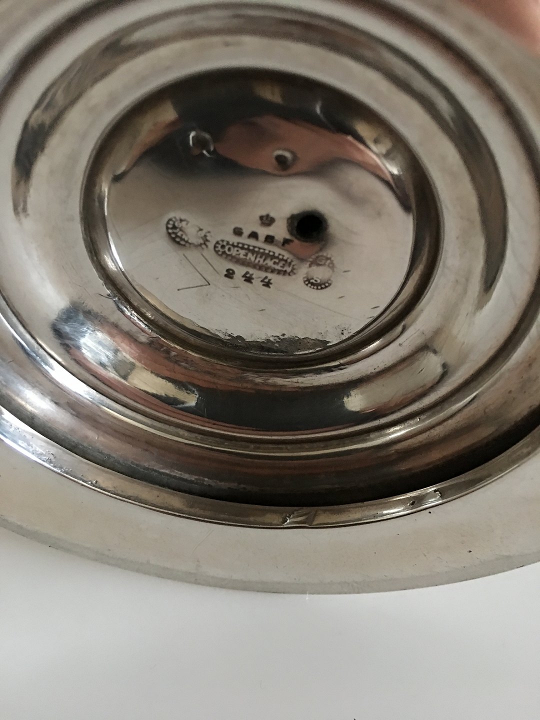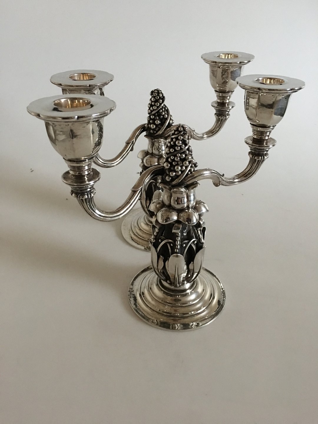 Georg Jensen Sterling Silver Candelabras No 244 with Grape and Leaf Ornament. From 1921 and with old marks. I beautiful condition. With detachable bobeches (candle holders) Measures 21 cm H (8 17/64"). Wingspan 23 cm (9 1/16") Each candelabra weighs 1330 grams / 46.90 oz.