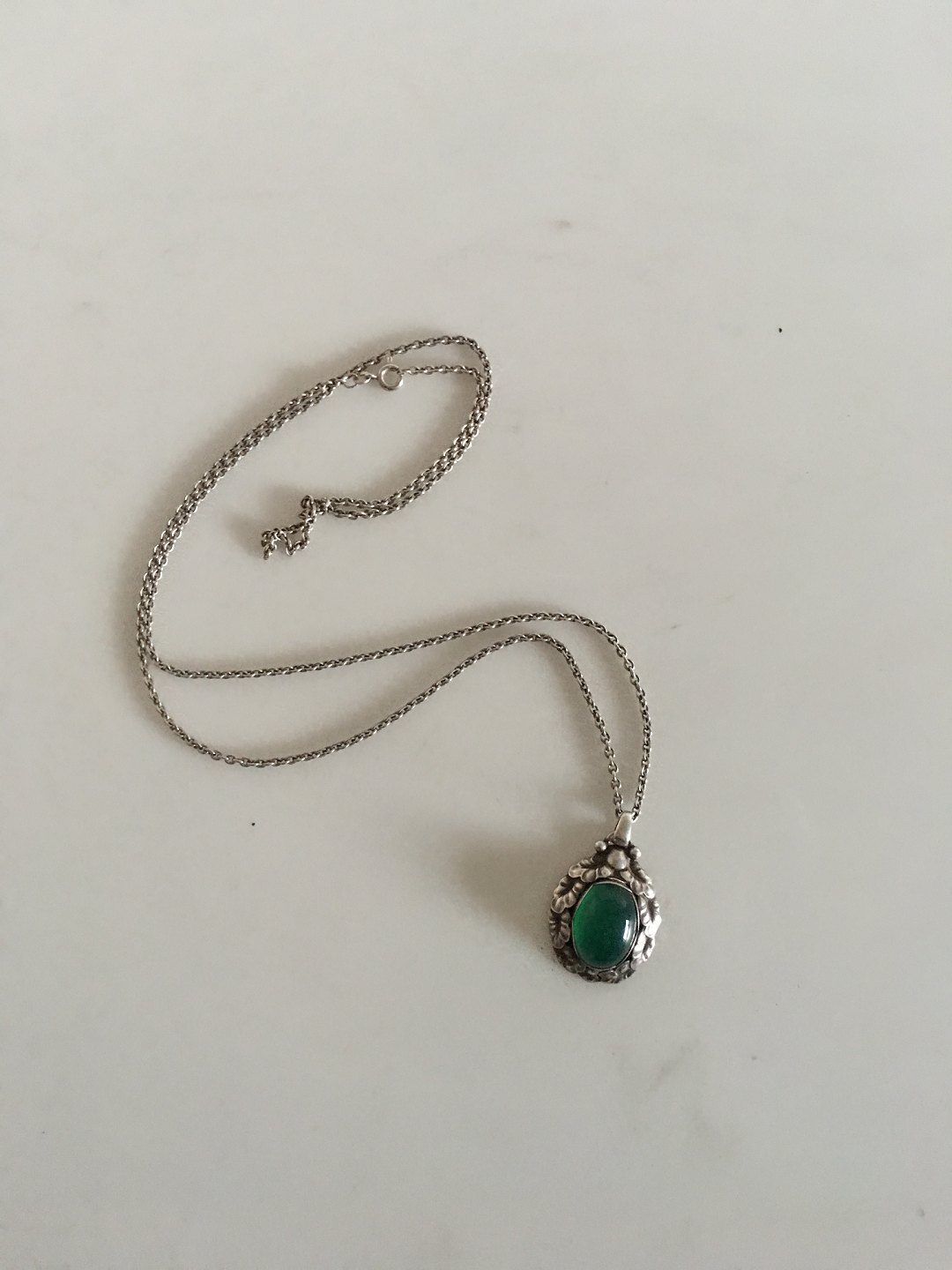 Georg Jensen Necklace with Sterling Silver Pendant No 56 with Green Agate. Chain measures 70 cm L (27 9/16"). Pendant measures 3 cm (1 3/16"). Combined weight of 16 grams (0.55 oz). From 1932-1945.