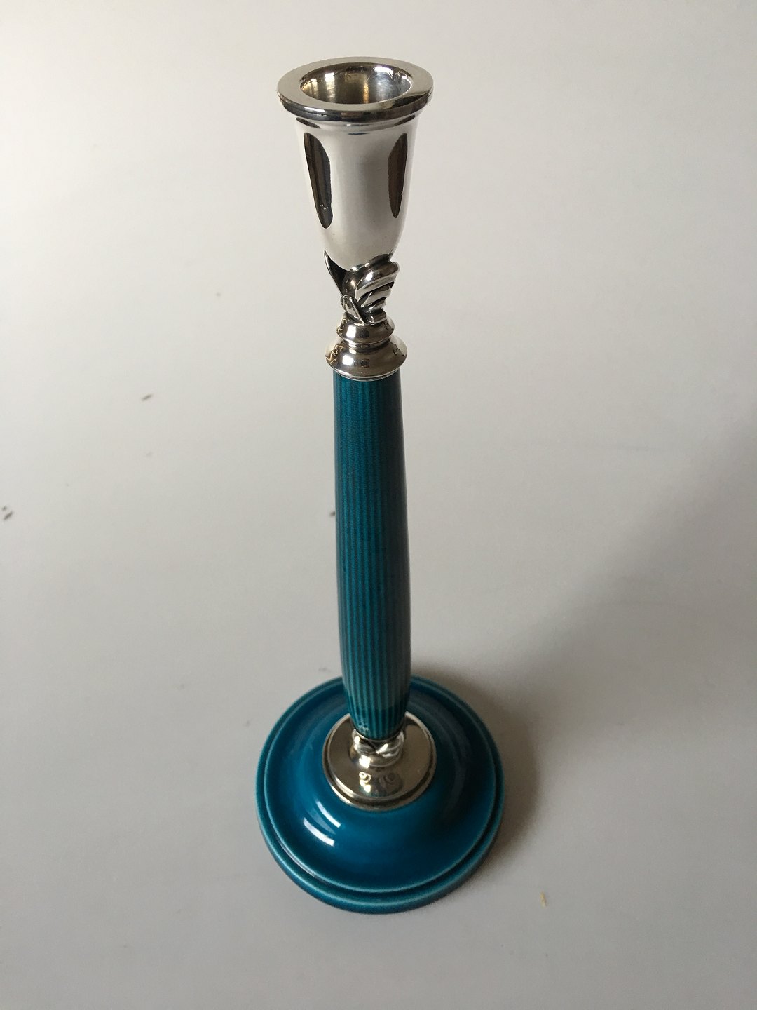 Georg Jensen Candlestick in Sterling Silver and Porcelain No 4001. Design by Harald Nielsen. Porcelain pieces by Bing & Grondahl. Marked Georg Jensen & Wendel. From 1945-1951. 29 cm H. (11 27/64")
