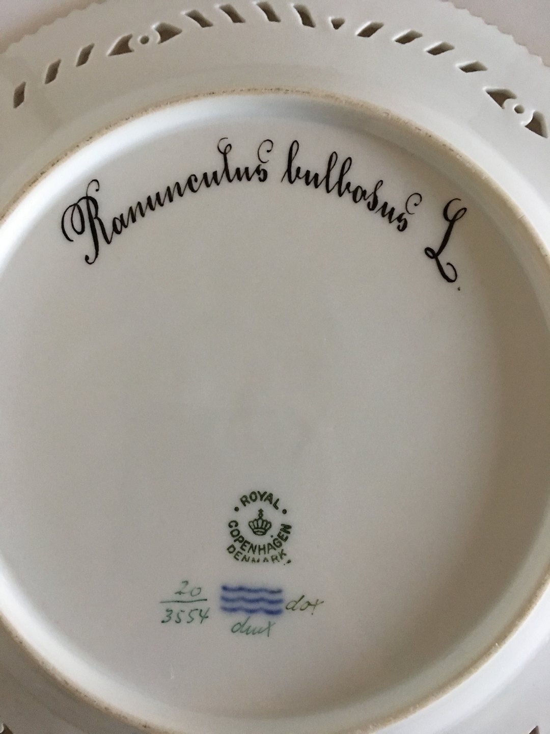 Royal Copenhagen Flora Danica Luncheon Plate with Pierced Border No 3554. Latin Name: Ranunculus Bulbosus. 23 cm (9 1/16"). 1st Quality. In perfect condition