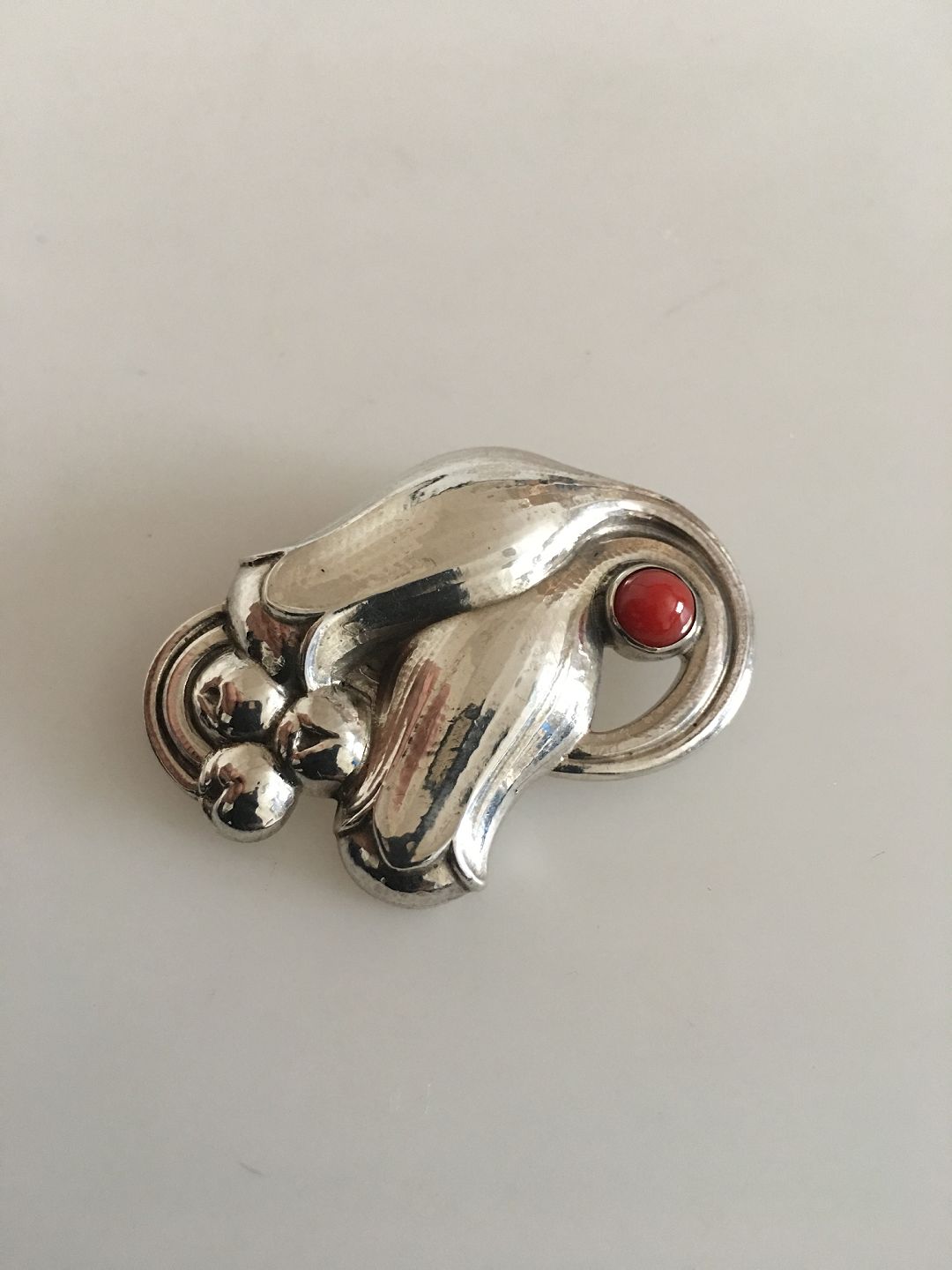 Georg Jensen Sterling Silver Tulip Brooch No 100B with Coral. Measures 4.5 cm / 1 49/64 in. Weighs 9 g / 0.35 oz. From after 1945.