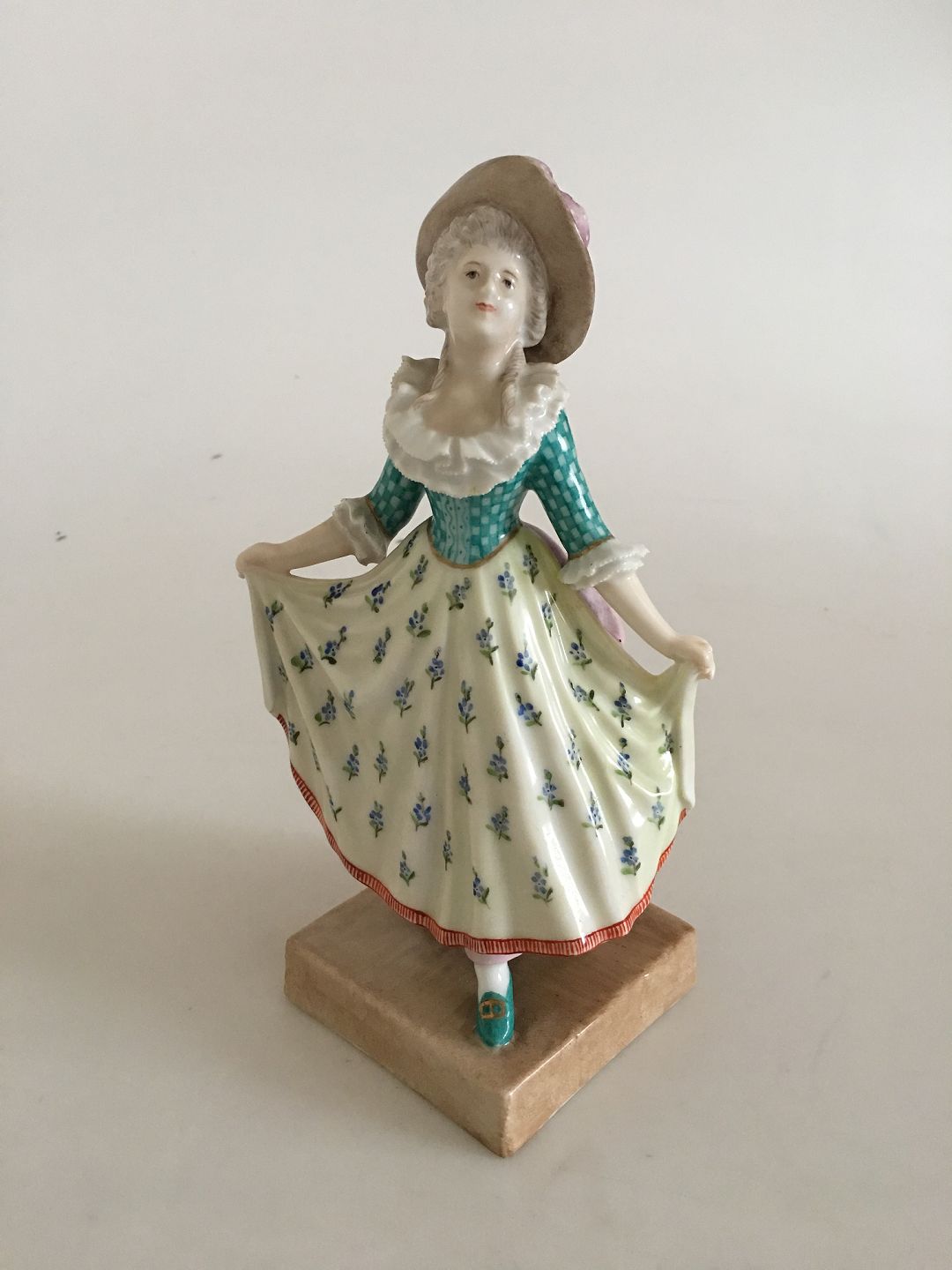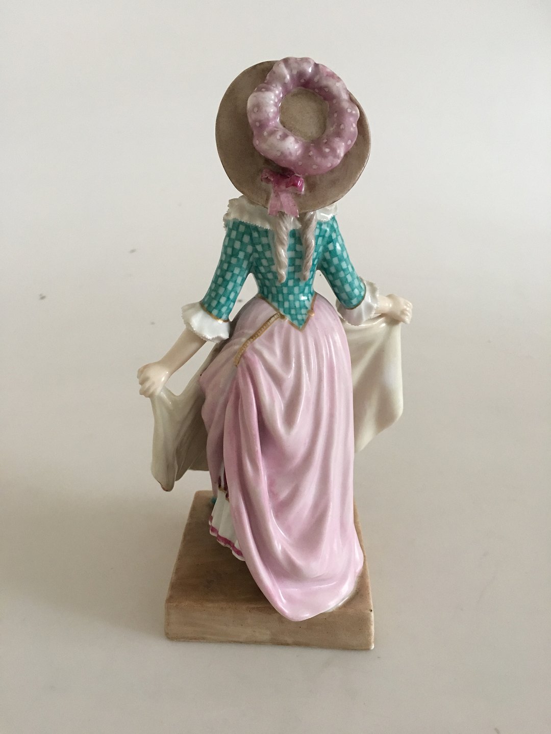 Royal Copenhagen Overglaze Figurine of Country Girl in Rococo Style. In good condition with the exception of a chip on the hats bow. With old Royal Copenhagen Stamp. 20 cm H (7 7/8")