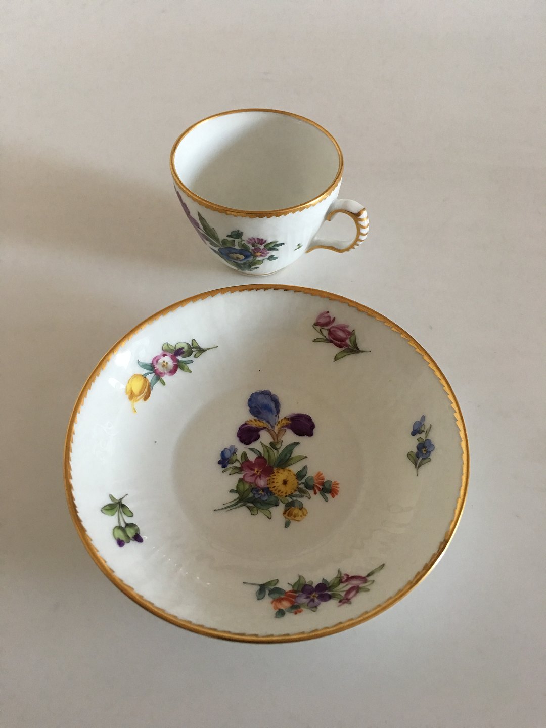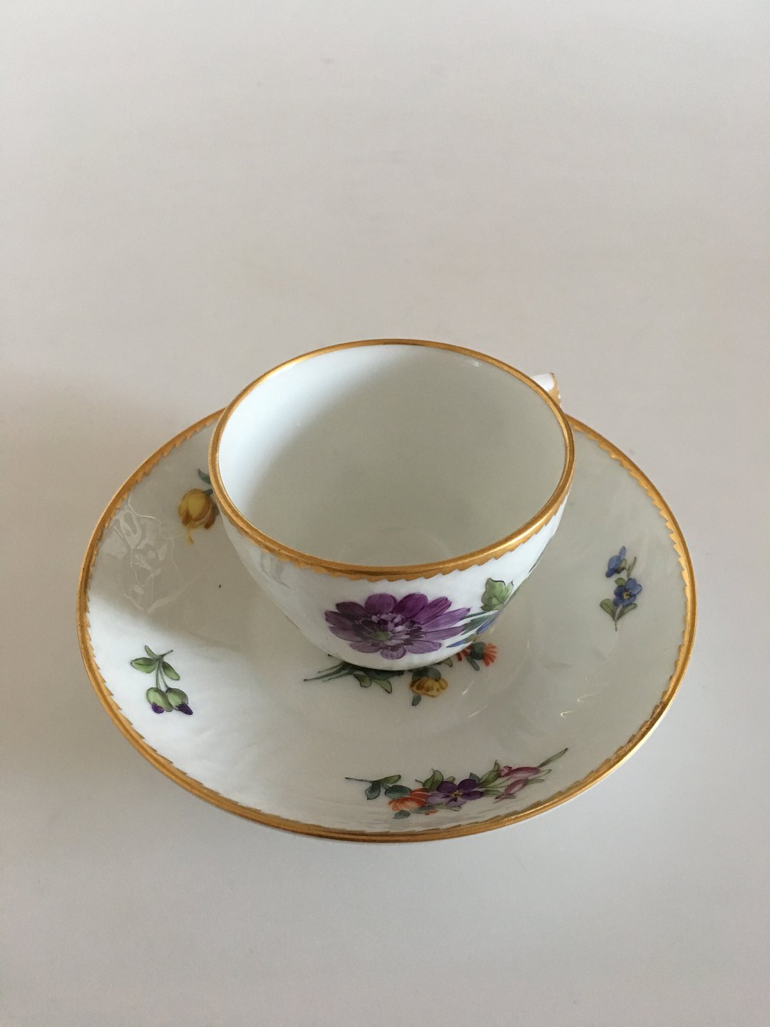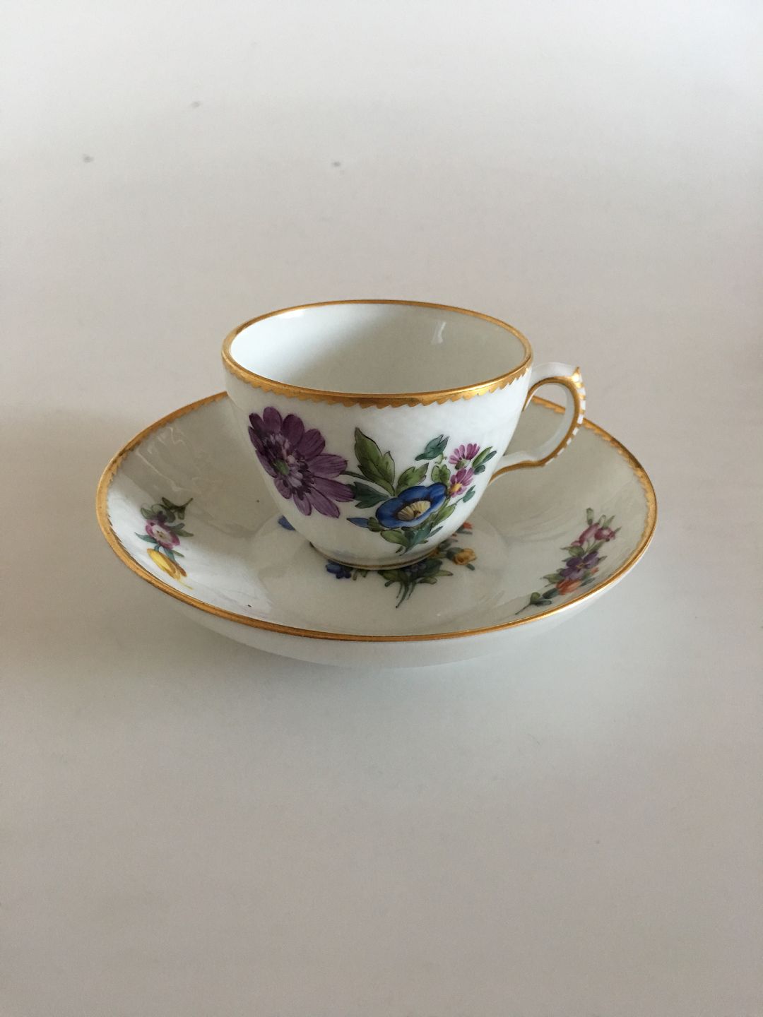Royal Copenhagen Full Saxon Flower Coffee Cup and Deep Saucer No. 1549. Cup measures 5.5 cm H (2 11/64 in.) 7.3 cm dia (2 7/8 in.) Saucer measures 13.5 cm dia ( 5 5/16 in.) 1st Quality.