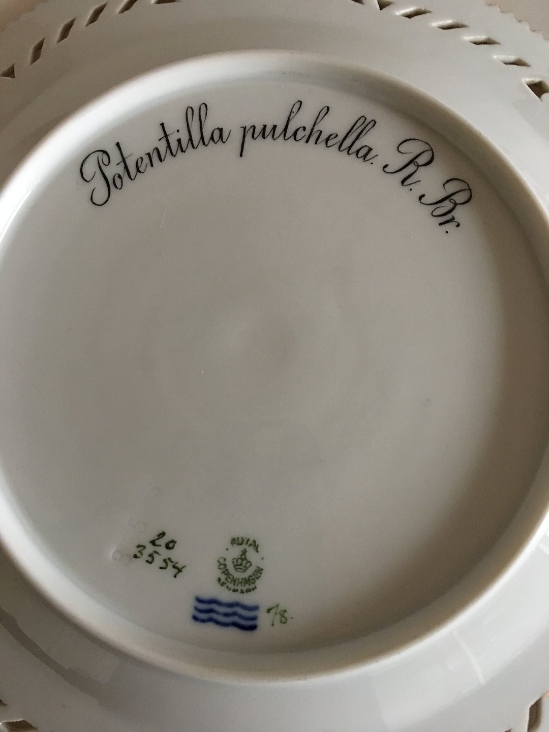 Royal Copenhagen Flora Danica Pierced Luncheon Plate No 20/3554. 23 cm (9 1/16"). Latin Name: Potentilla Pulchella. With old mark from 1923-1934.