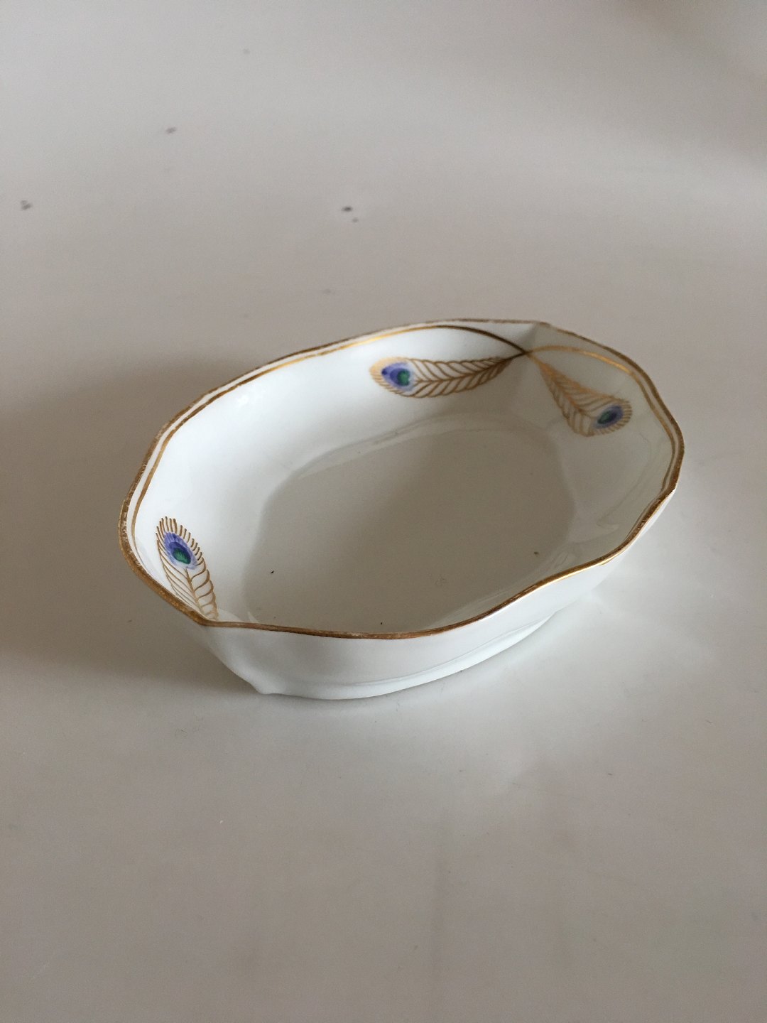 Royal Copenhagen No 118 Oval Bowl w. Golden Peacock Feather Ornament. In good whole condition, but the gold on the edges has some wear to it. Antique, Rare Dinner Service Pattern from Royal Copenhagen