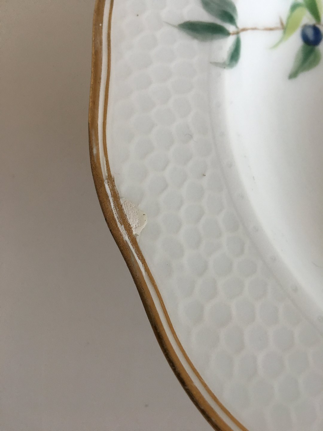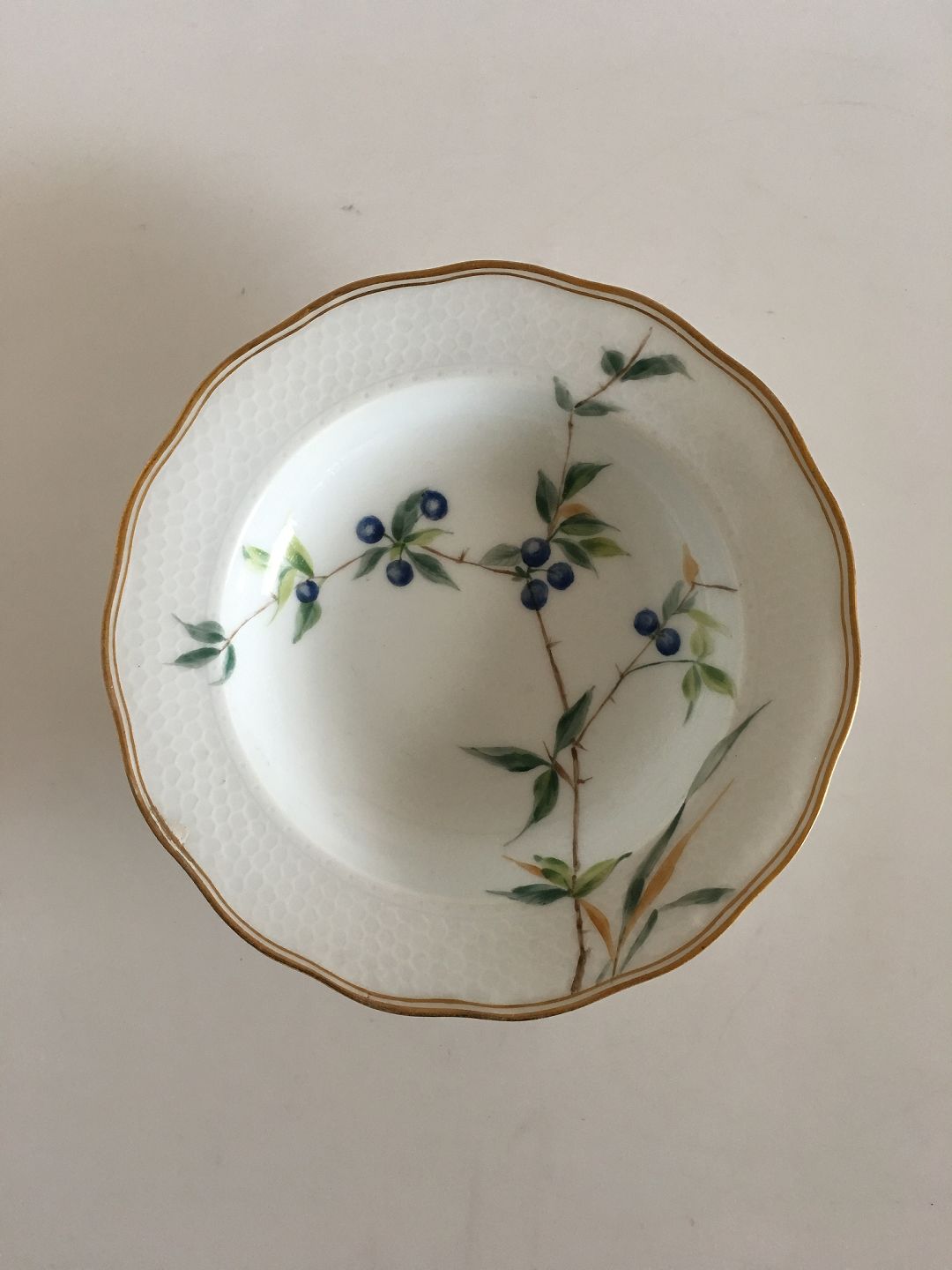 Royal Copenhagen Deep Plate No 166 with Handpainted Flowers and Gold. 21 cm (8 17/64"). Has a reparation on the edge (look to picture). Otherwise in presentable condition.