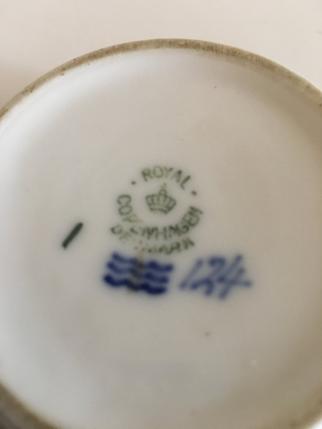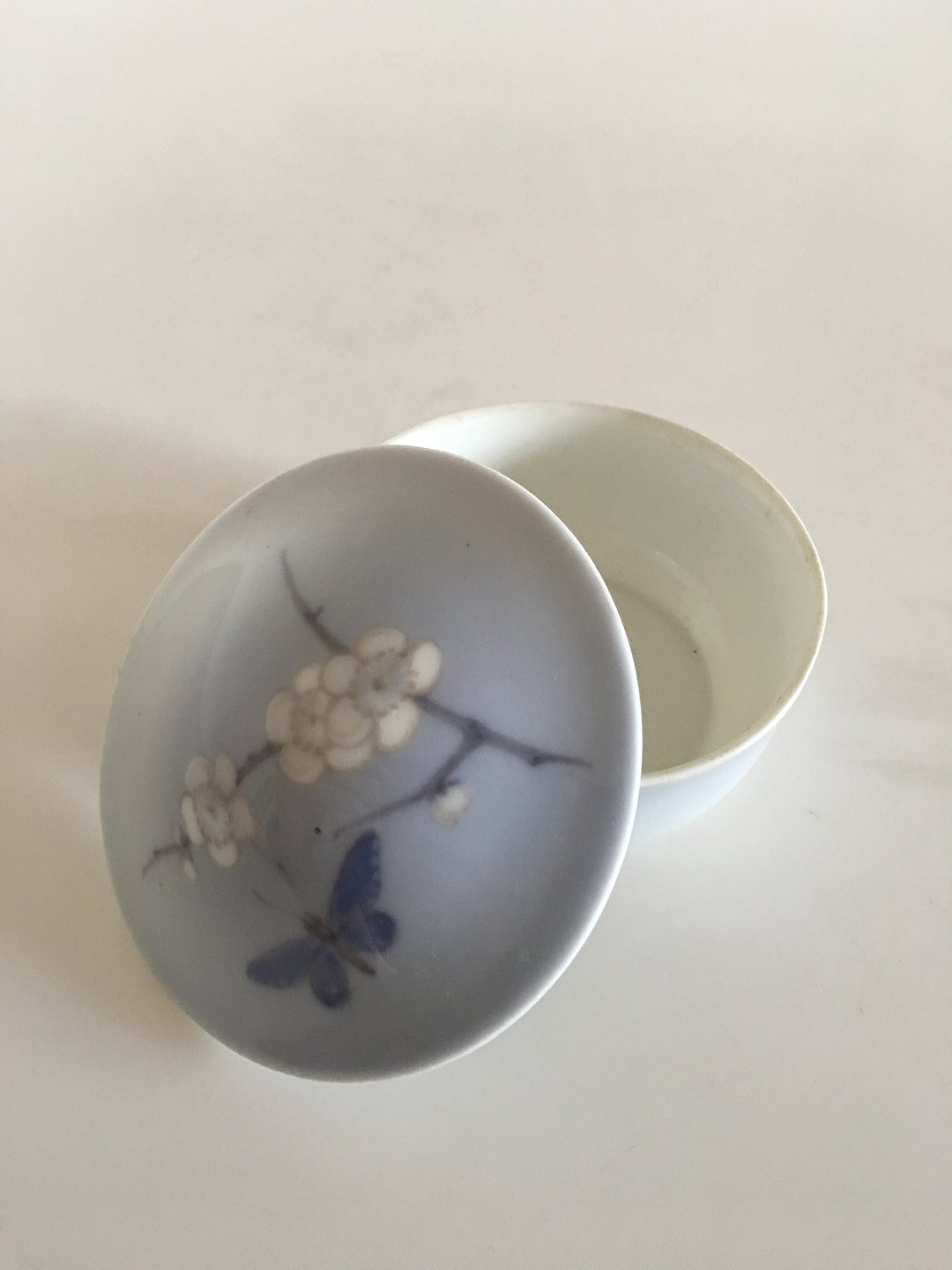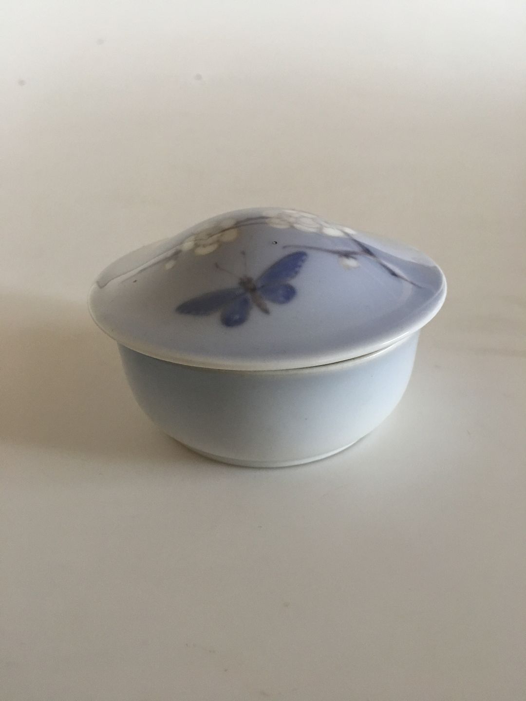 Royal Copenhagen Art Nouveau Lidded Bowl with Flower and Butterfly Motif No 1. 4.5 cm H (1 49/64"). 9.5 cm dia (3 47/64"). In nice whole condition.