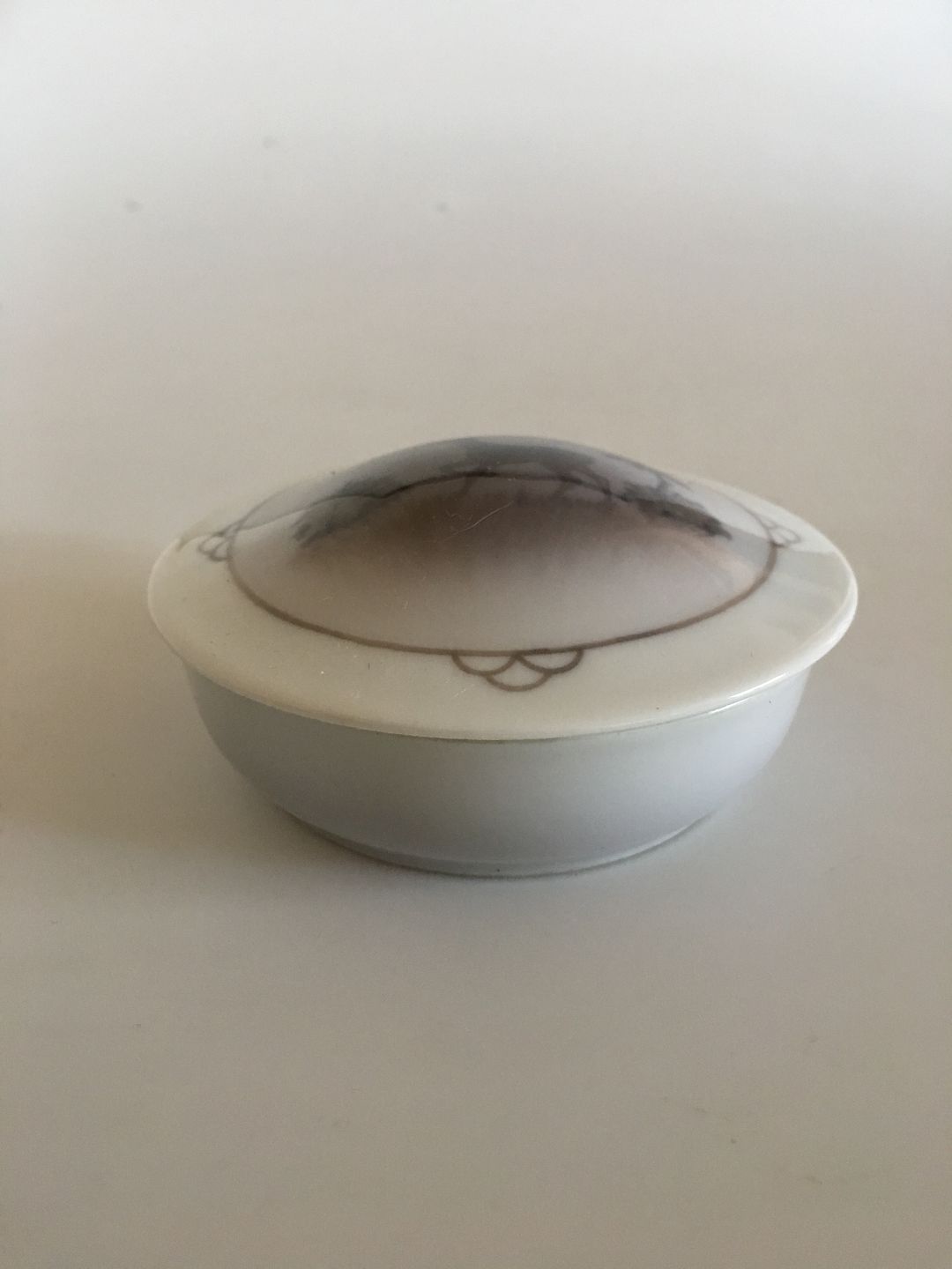 Royal Copenhagen Art Nouveau Lidded Bowl with Deer Motif No 2579/2458. 3.5 cm H (1 3/8"). 10.5 cm dia (4 9/64"). 1st Quality in perfect condition.