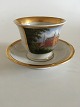 Royal Copenhagen Antique Morning Cup and Saucer with Handpainted Motif of Frederiksborg Castle. The motif is intact and the gold looks nice with only some minor wear. The handle has a reparation and a hairline. The cup is 9 cm H (3 35/64") 11.5 cm dia (4 17/32").