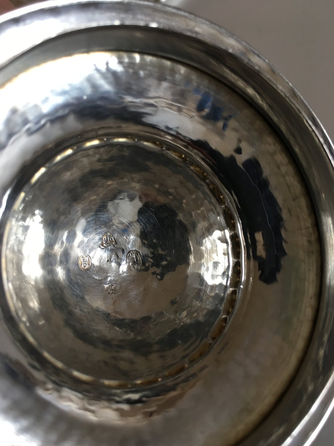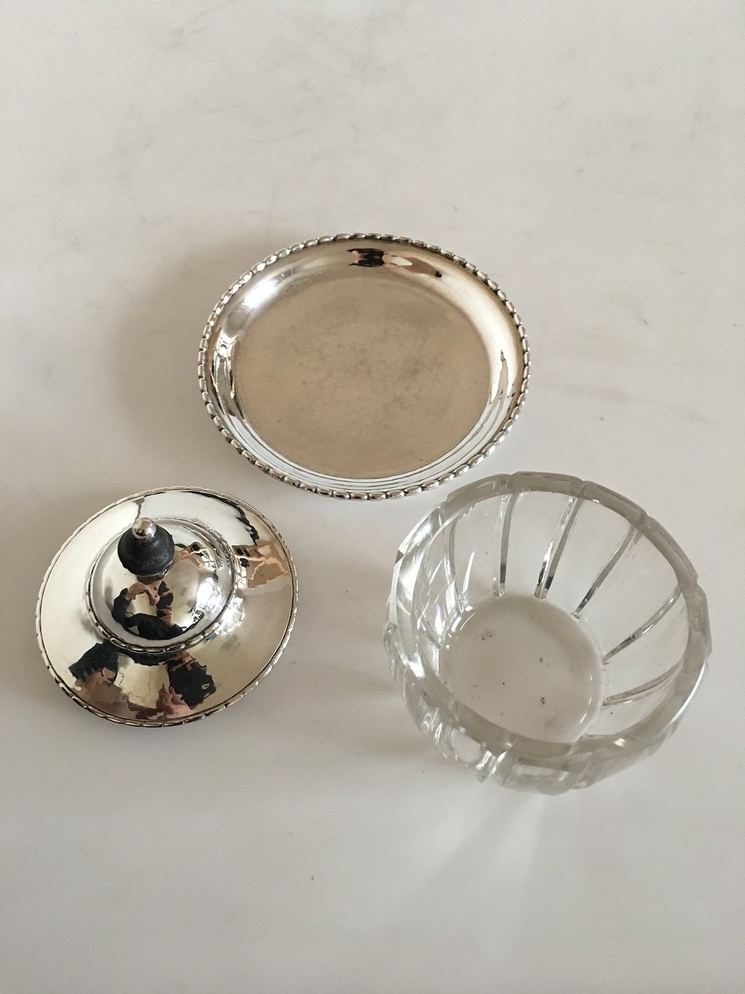 Grann & Langley (Danish Silver Smithy) Lid with Crystal Jar on a Georg Jensen Sterling Silver Tray No 209E. The Glass Jar with Lid is 9.5 cm H (3 47/64") and 7.5 cm dia (2 61/64"). In good condition. The tray is 10 cm dia (3 16/16") weighs 66 grams / 2.35 oz). From 1932-1945.
