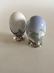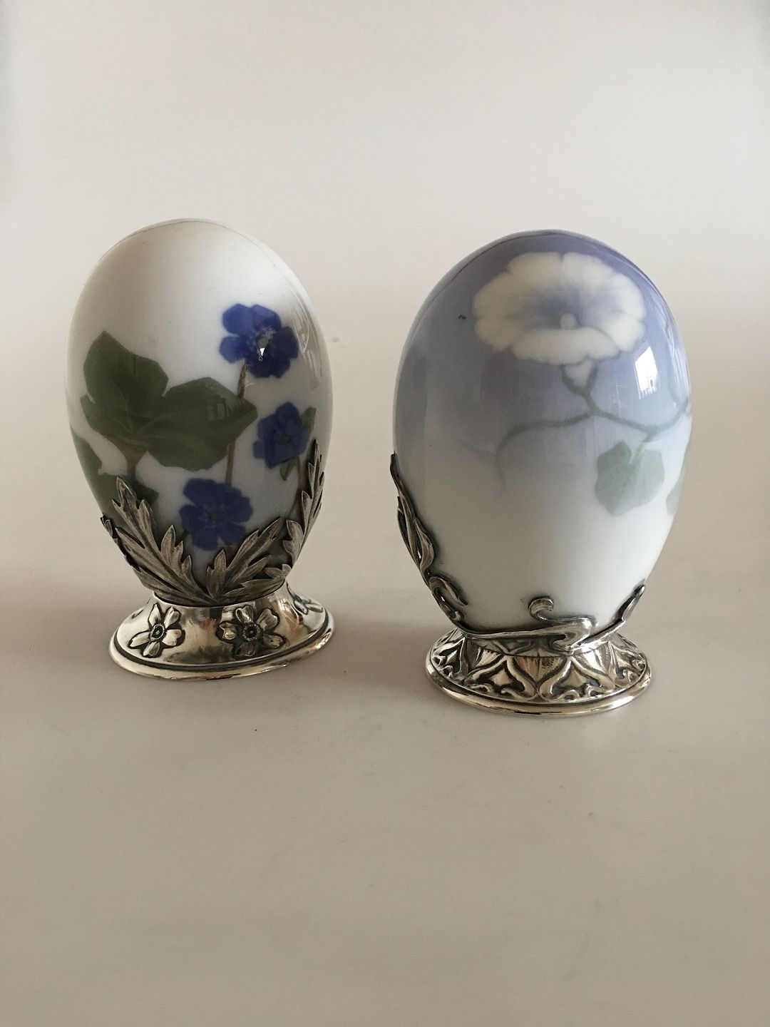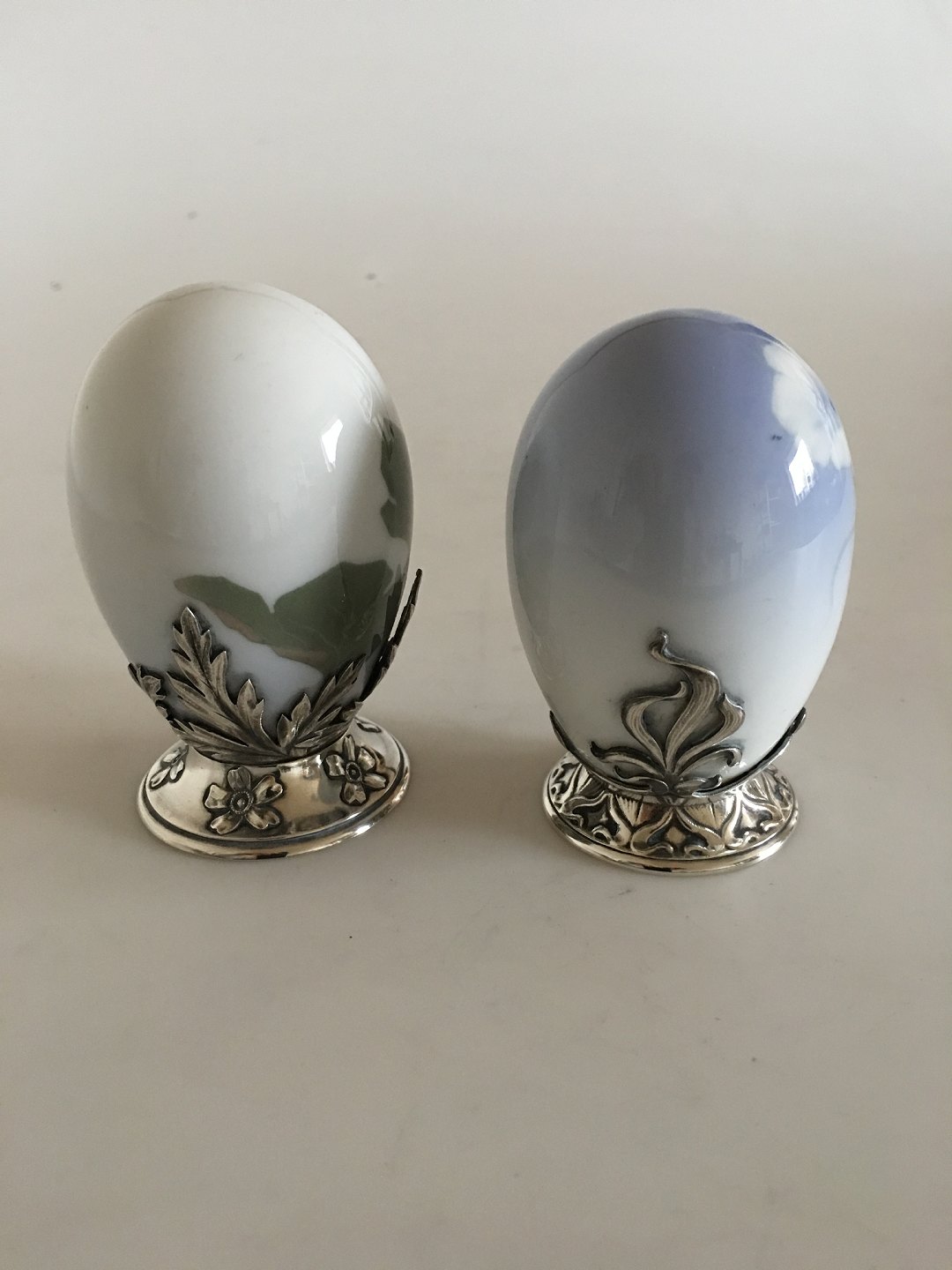 Pair of Royal Copenhagen Art Nouveau Eggs with A. Michelsen Stirling Silver Mounted Pieces. The Porcelain eggs are in perfect condition. Both are 9 cm tall (3 35/64"). The listed price is for the pair, if you are only interested in one og the eggs, please contact us via phone or email.