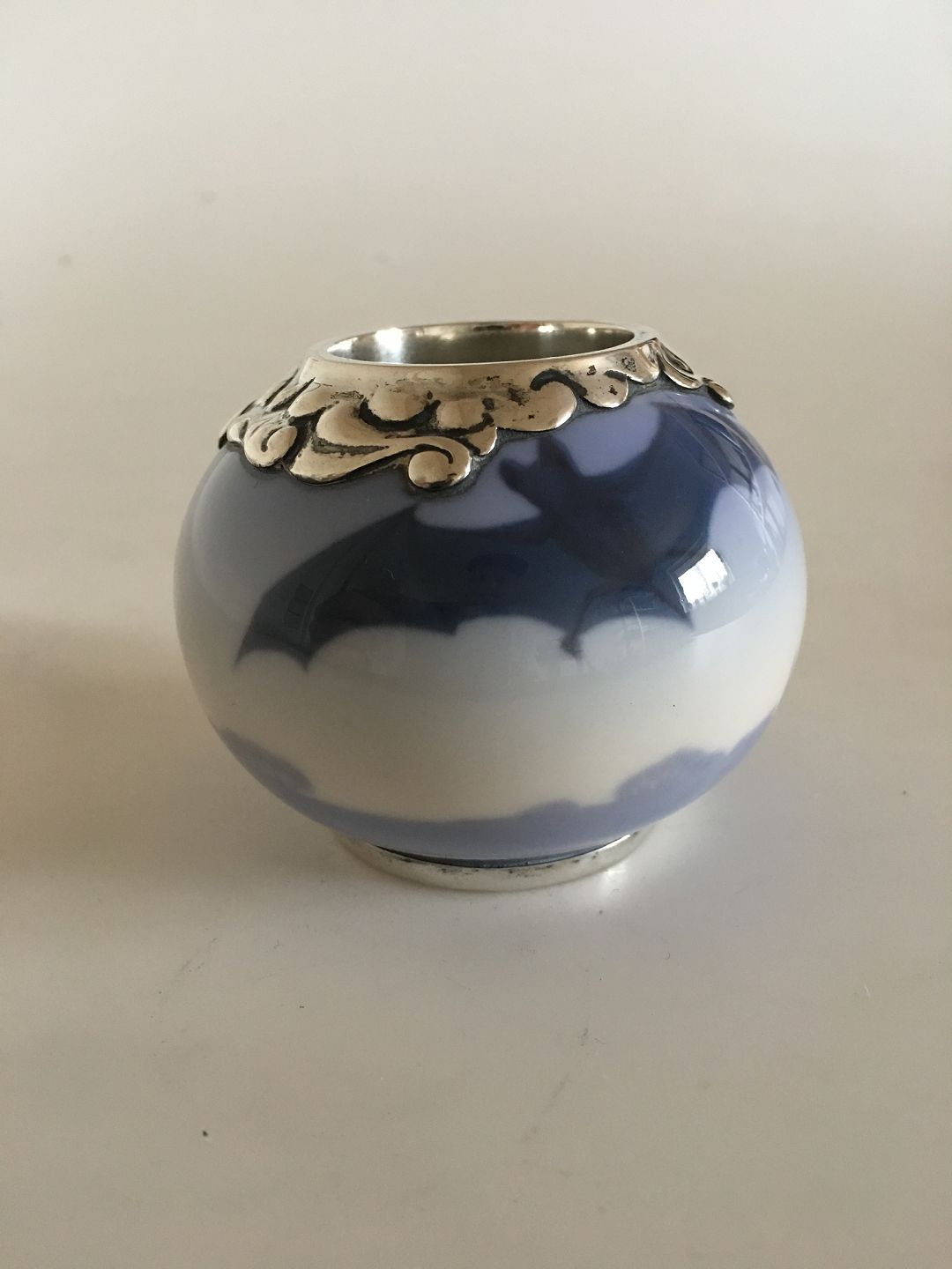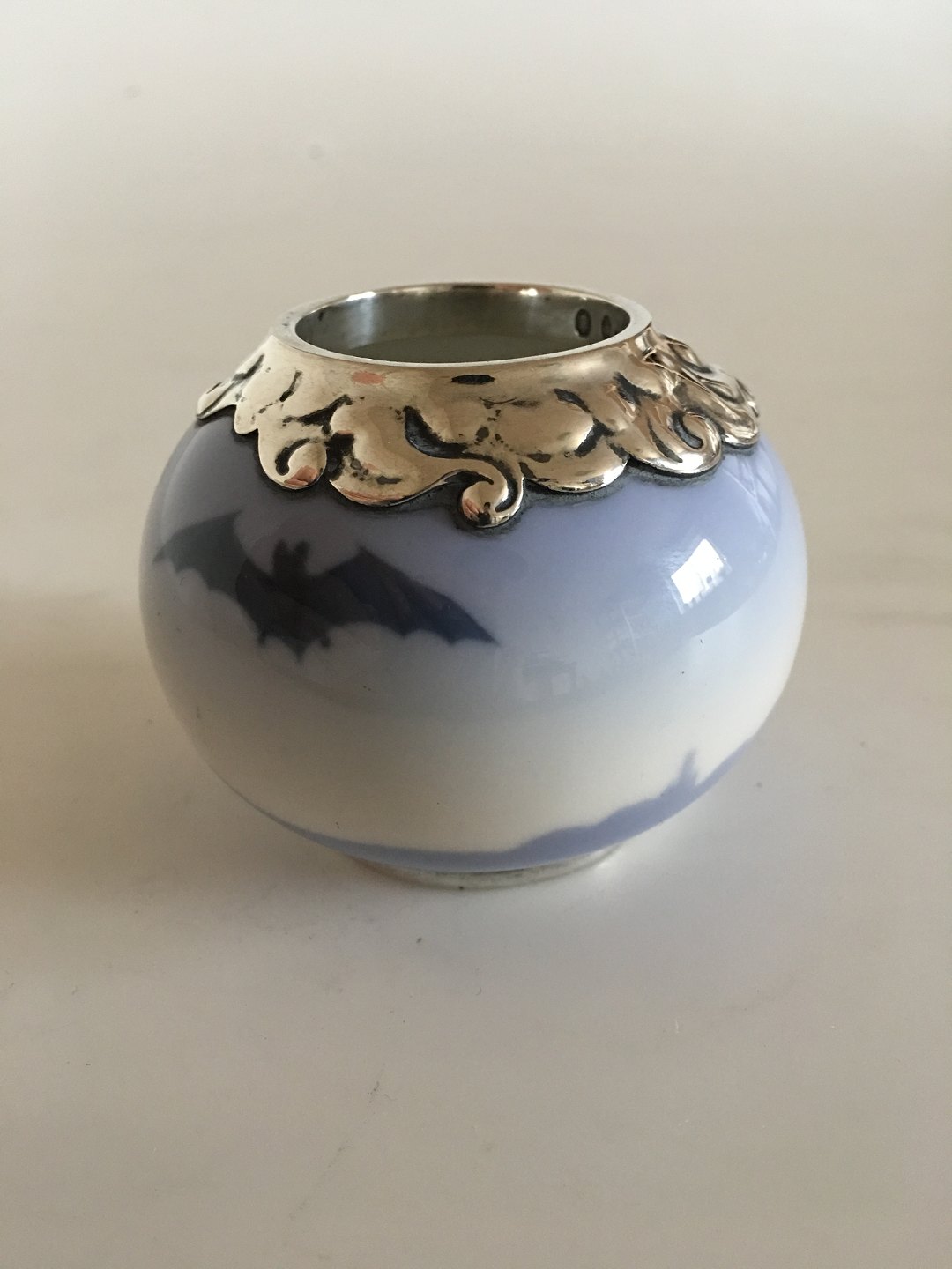 Royal Copenhagen Art Nouveau Vase No 225/42A with Bat Motif and A. Michelsen Silver Mounted Piece. The vase has a small hairline chip (look at picture), otherwise in nice condition. 6.5 cm H (2 9/16").