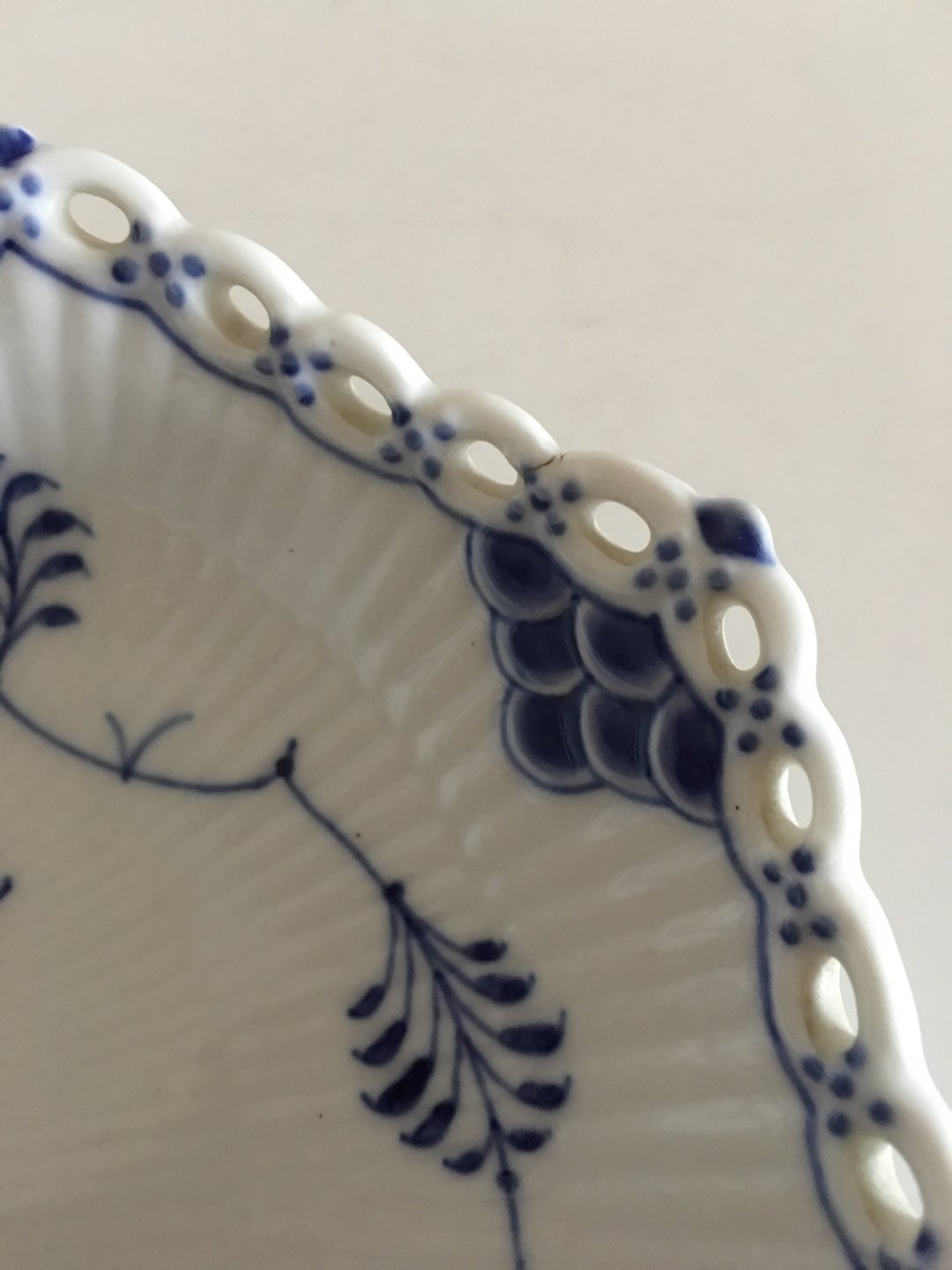 Royal Copenhagen Blue Fluted Full Lace Bowl No 1075. 19 x 16 cm. 1st Quality. In nice whole condition, but has a few burning mistakes on the lace part (look to picture for detail).