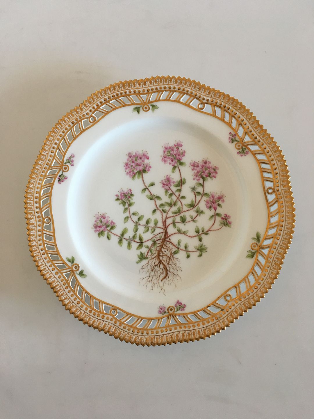 Royal Copenhagen Flora Danica Luncheon Plate with Pierced Border No 3554. 22.5 cm dia (8 55/64"). In nice whole condition. Latin Name: Thymus Serpyllum. From 1894-1900