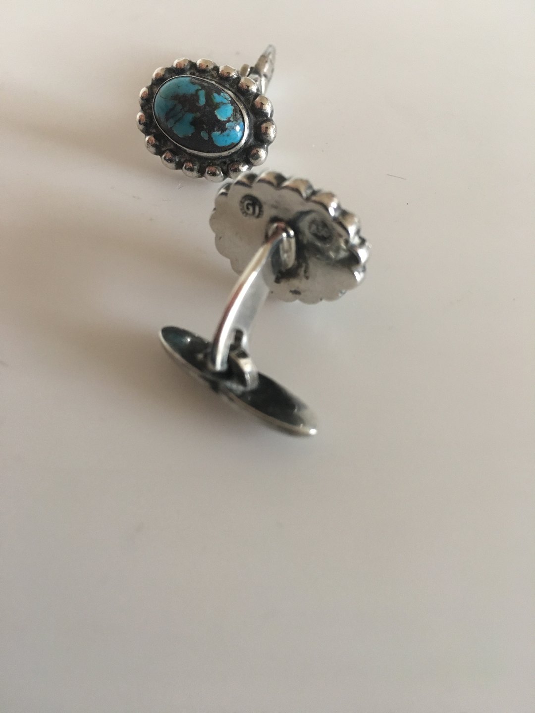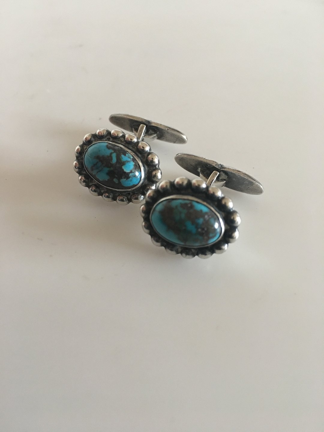 Georg Jensen Silver Cuff Links No 26 with Turquoise Stones. With early 1920s Georg Jensen Marks. 1.6 cm (0 5/8"). Weighs 14 grams. In nice condition.