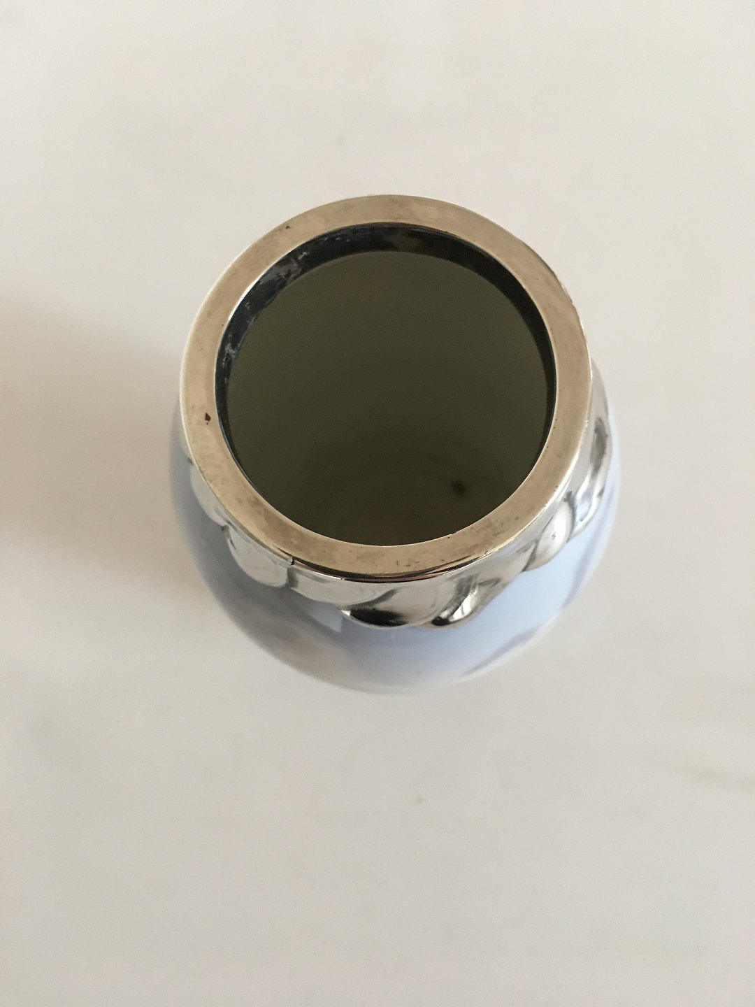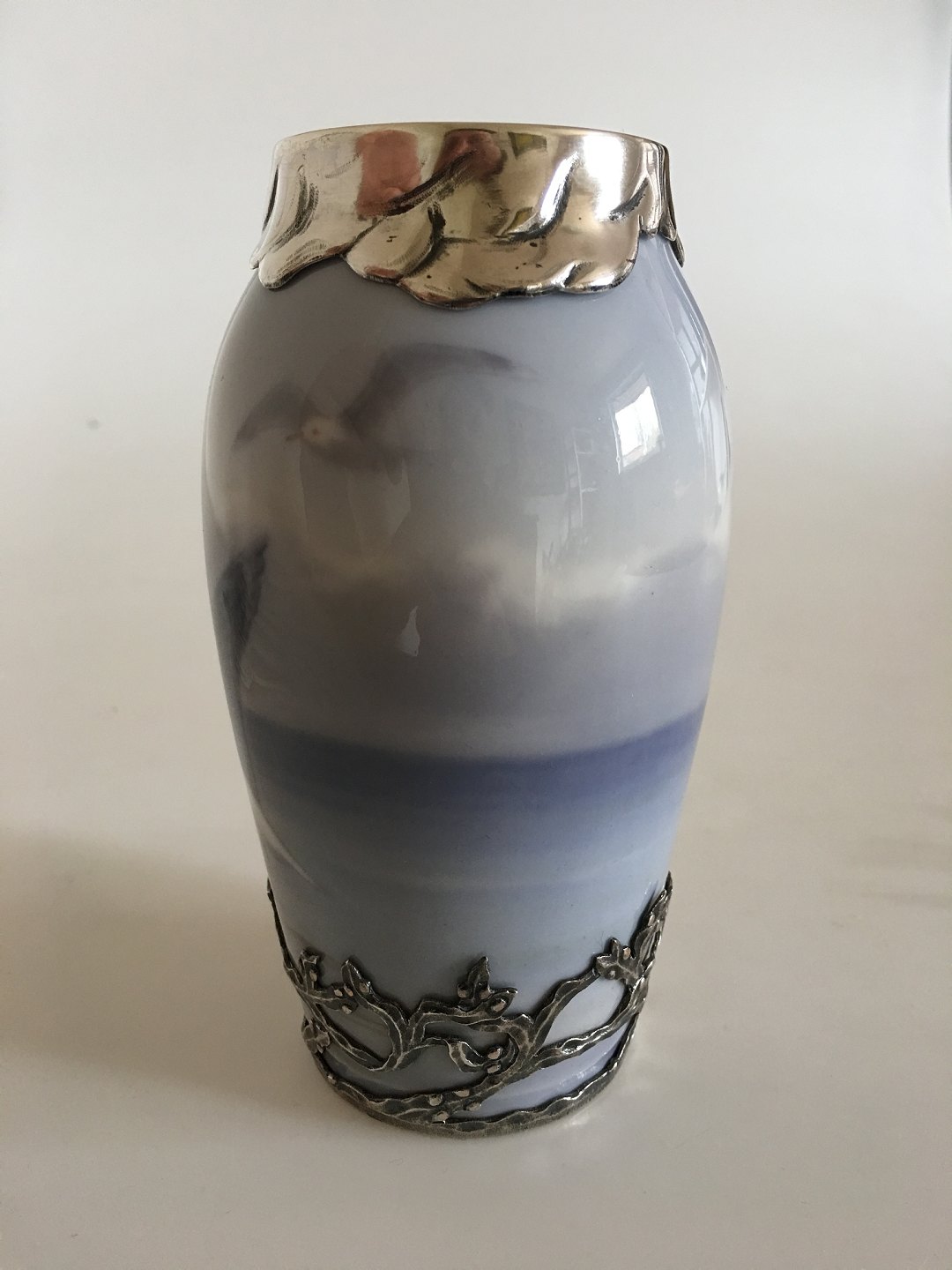 Royal Copenhagen Art Nouveau Vase No. 1138/88A with Seagull and Sea Motif. Anton Michelsen Sterling Silver Top and Bottom Piece. 14 cm H. 1st Quality. In nice whole condition.