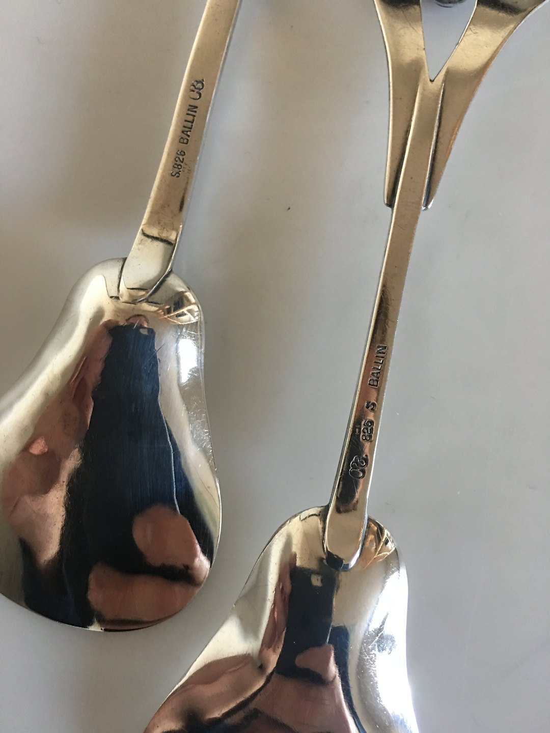 A Pair of Mogens Ballin Silver Spoons with Blue Stones. Measures 13.1 cm / 5 5/32". In nice condition. One of the spoons have a little wear in the shape of some unevenness on the spoon part, only noticed when feeling with the hand. With early Mogens Ballin Marks.