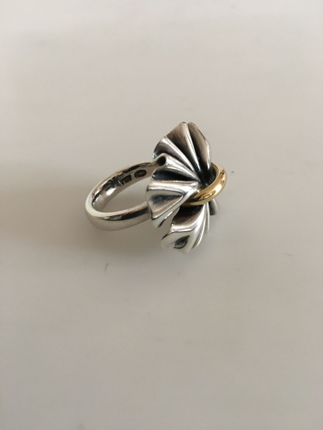 Georg Jensen Sterling Silver and 18K Gold Lene Munthe Ring No 400. Ring Size 57 (US size 8). Weighs 14 grams (0.45 oz). Ornament measures 2.8 x 2 cm (1 7/64" x 0 25/32")