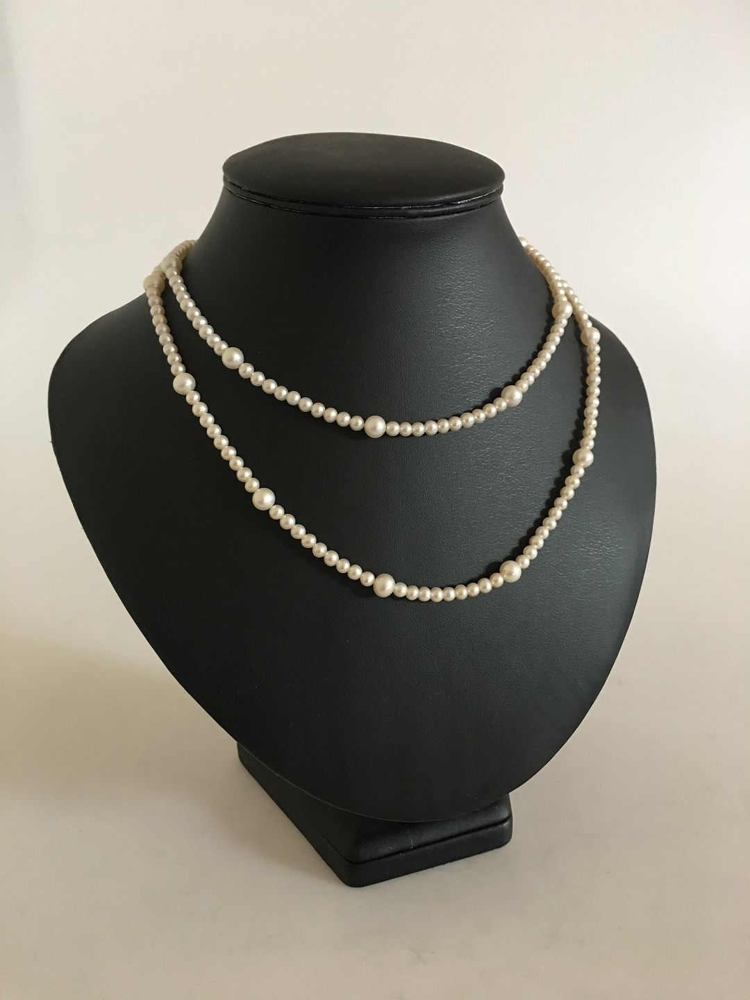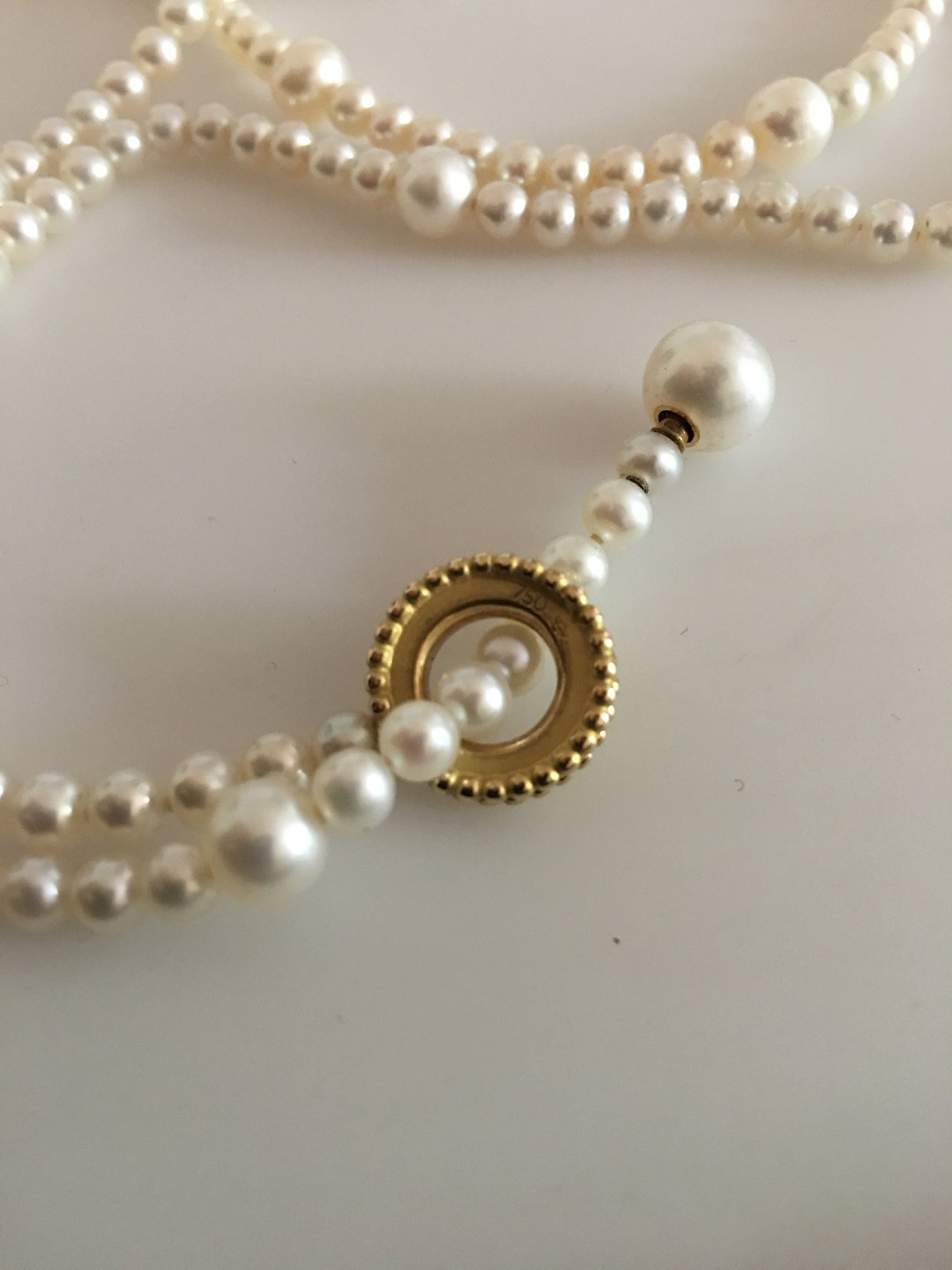 Georg Jensen Collier with White Freshwater Cultured Pearls and Gold Lock. 88 cm L (34 41/64"). Round pearls in beautiful condition. A collier offers several styling options. The Pearl Are 4 mm and the large ones Are 7mm