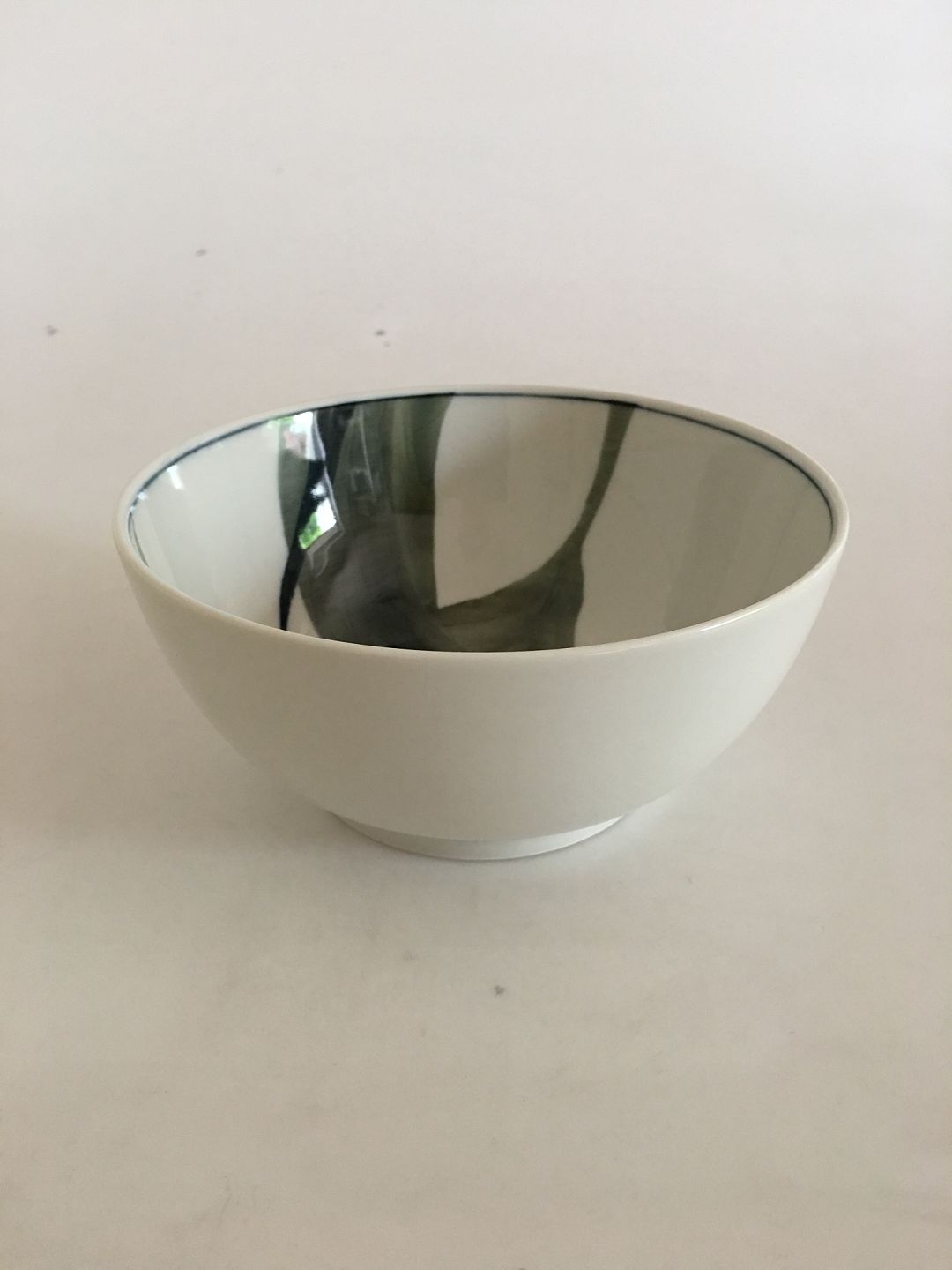 Royal Copenhagen Modern Bowl with Green Leaf Motif by Andy CT?. 7.5 cm H (2 61/64"). 16 cm dia (6 19/64"). From 1982