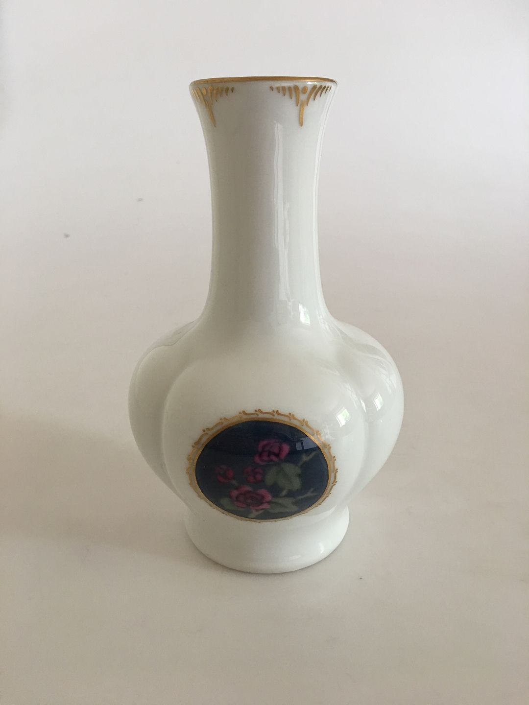 Royal Copenhagen Vase No 1981/1557 with Gold and Flower Motif. 16 cm H (6 19/64"). 2nd Quality. In nice condition.