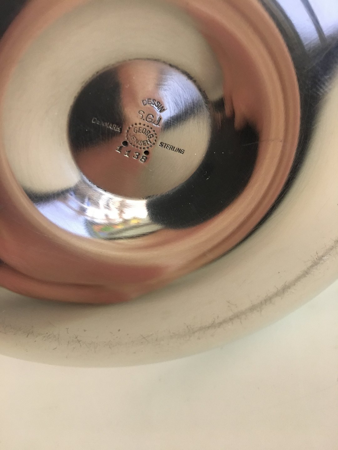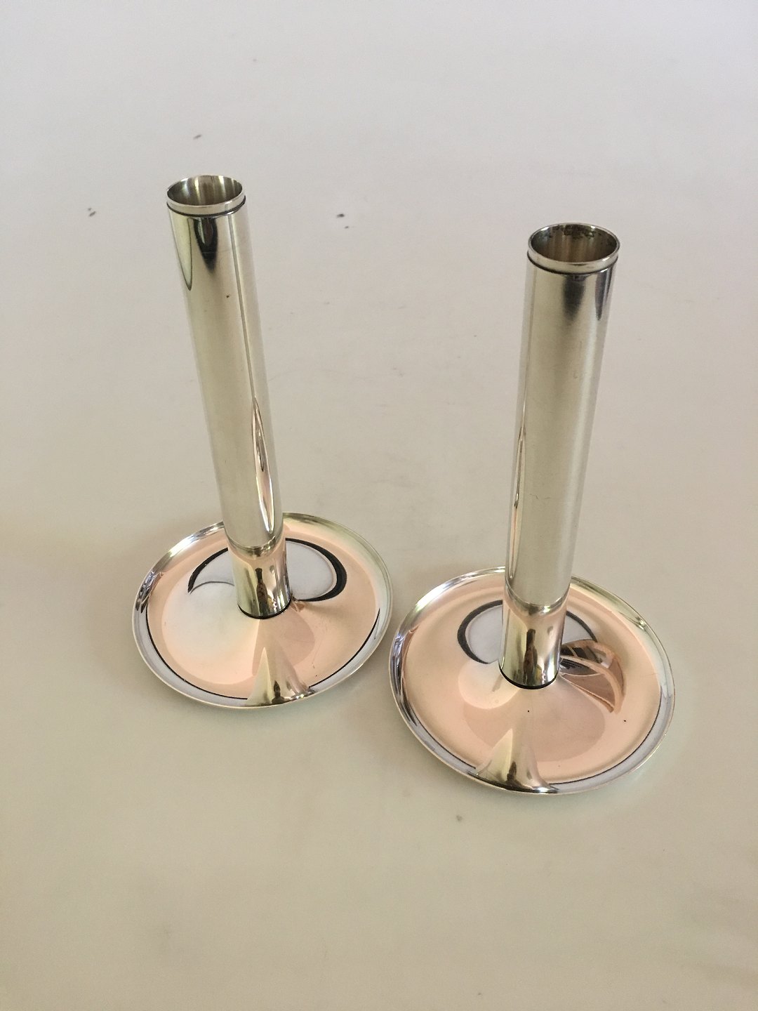Georg Jensen Sterling Silver Candlesticks No 1138 by Soren Georg Jensen. 19 cm H (7 31/64"). Feet 11 cm dia (4 21/64"). One stick weighs 218 grams / 7.70 oz. In perfect condition.