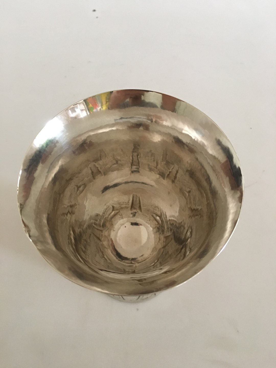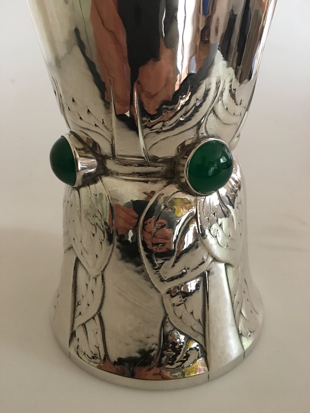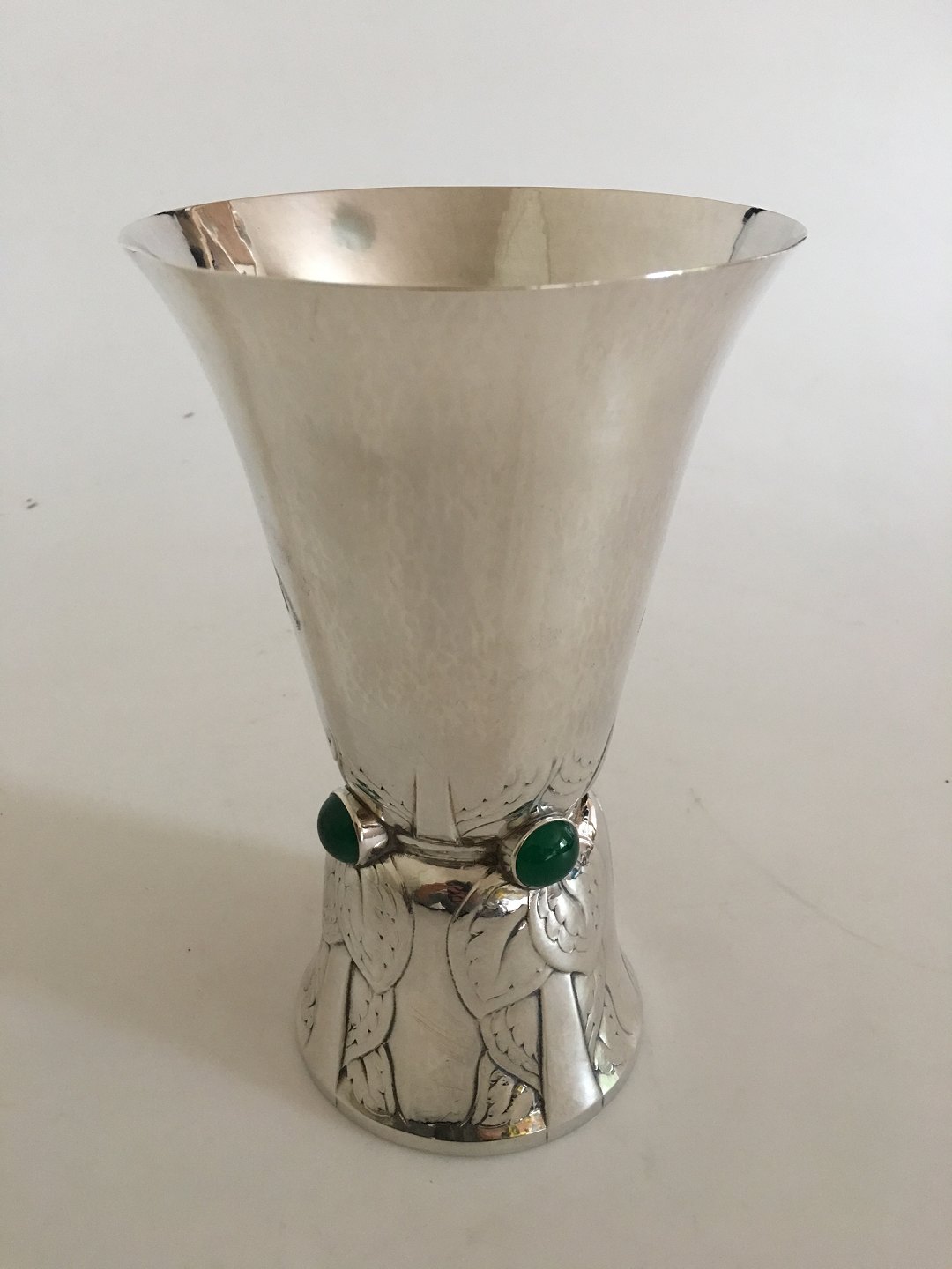 Georg Jensen Sterling Silver Vase no. 116 ornamented with 4 green agates. With GJ marks from ca. 1915-1930. The vase measures 20 cm high (7 7/8") with a top diameter of 12.5 cm (4 59/64") and bottom diameter of 9 cm (3 35/64"). Alle four agates are in great condition without any cracks or chips. The vase weighs 405 grams (14.25 oz).