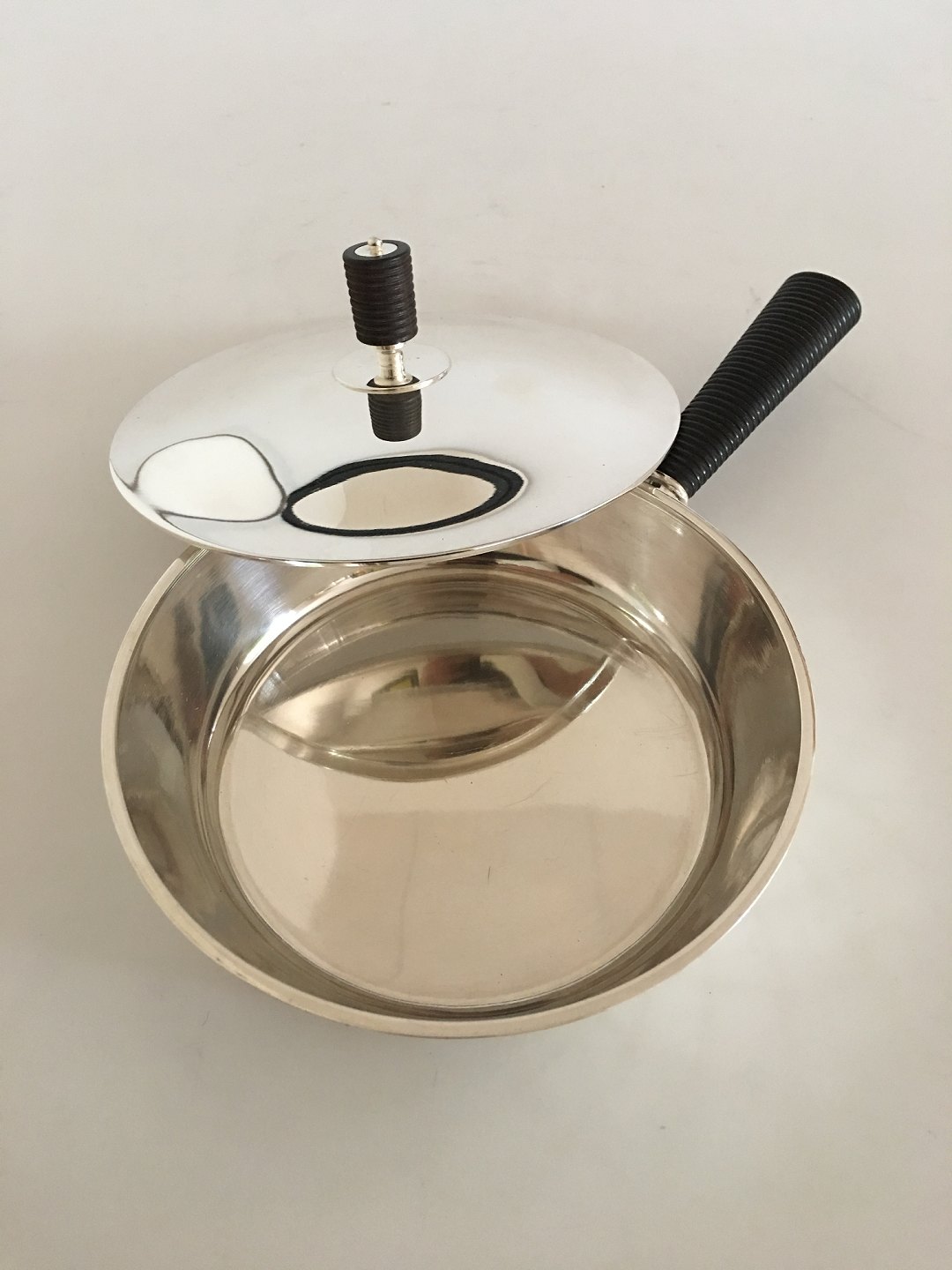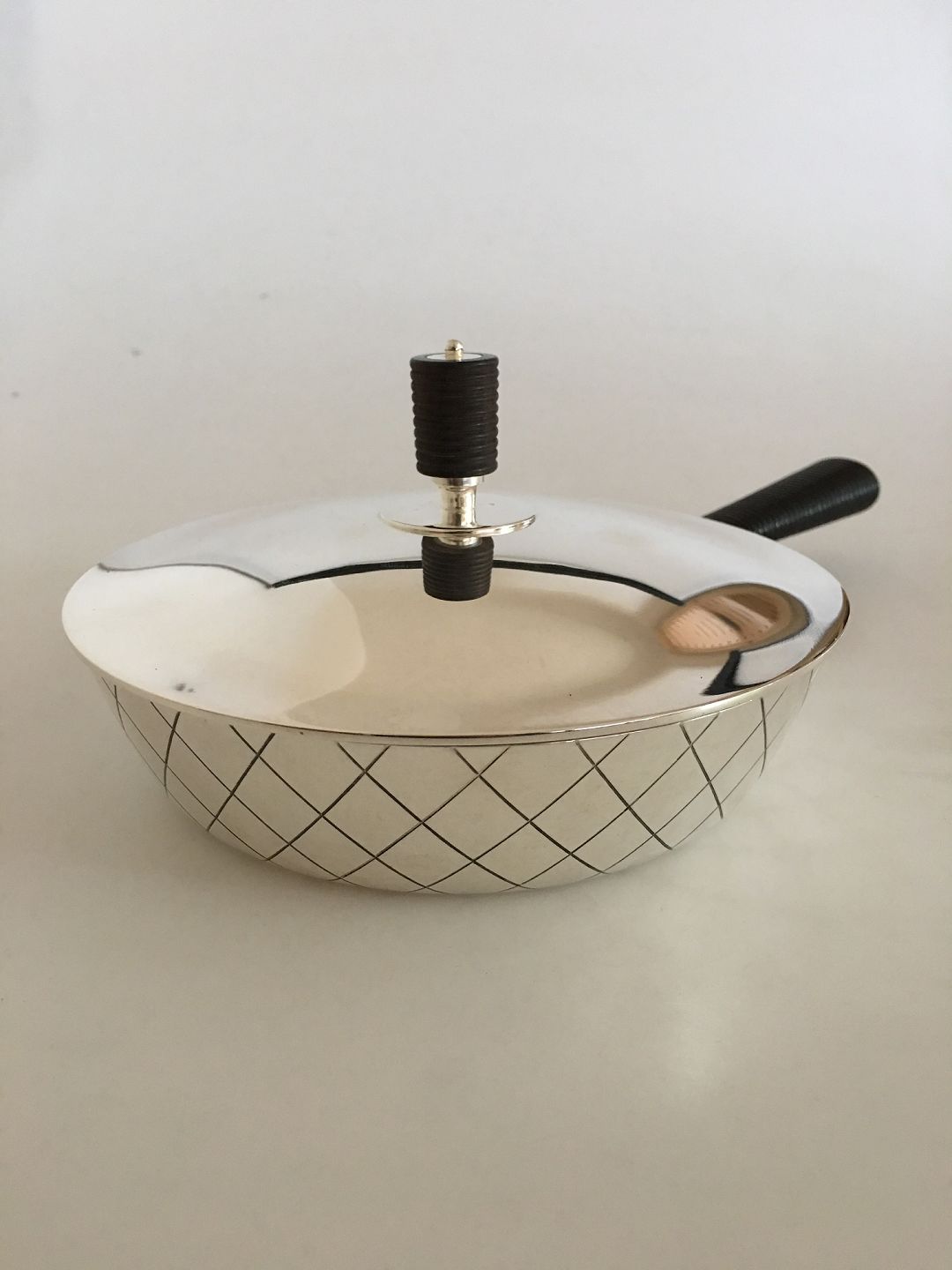 Georg Jensen Skillet in Sterling Silver designed by Sigvard Bernadotte in Art Deco Style. The skillet measures 4 cm high (1 37/64") and has a diameter of 16 cm (6 19/64"). Its total weight is 558 grams or 19.70 oz. The skillet is with Georg Jensen marks from after 1945 and is in beautiful condition.