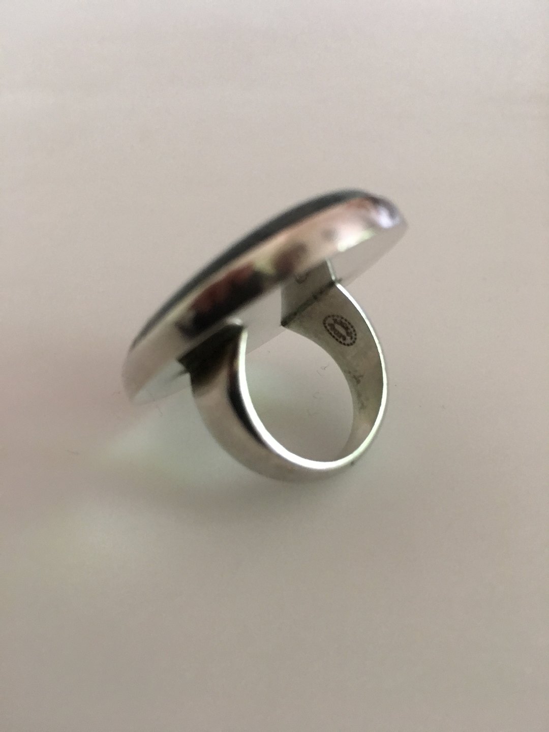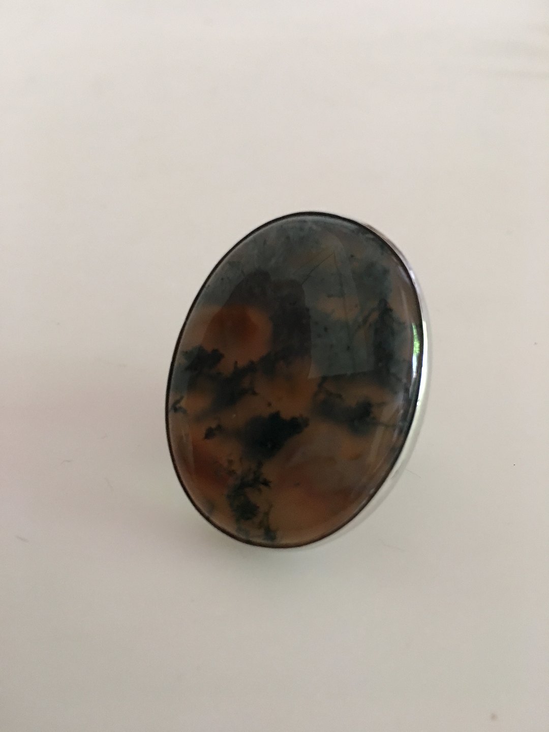 Georg Jensen Sterling Silver Ring No 90D with Oval Stone, Grey and Orange. Ornament measures 3.5 cm / 1 3/8 in. x 2.5 cm / 0 63/64 in. Ring Size 48 / US 4 1/2. Weighs 16 g / 0.60 oz. Made after 1945.