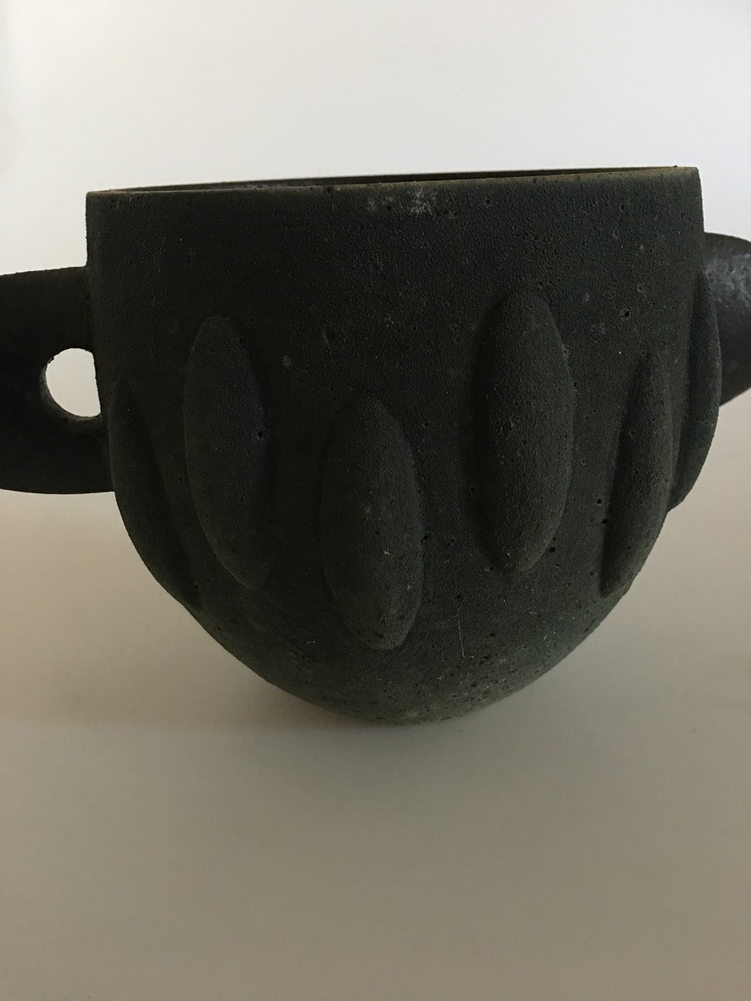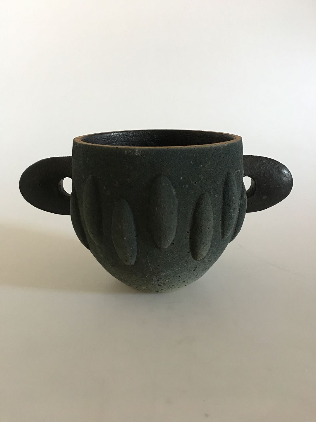 Royal Copenhagen Unique Modern Stoneware Vase by Pia Langelund. Two handles vase with a nice rough moss looking texture. The vase is 12.5 cm H (4 59/64"). 13 cm dia (5 1/8")
