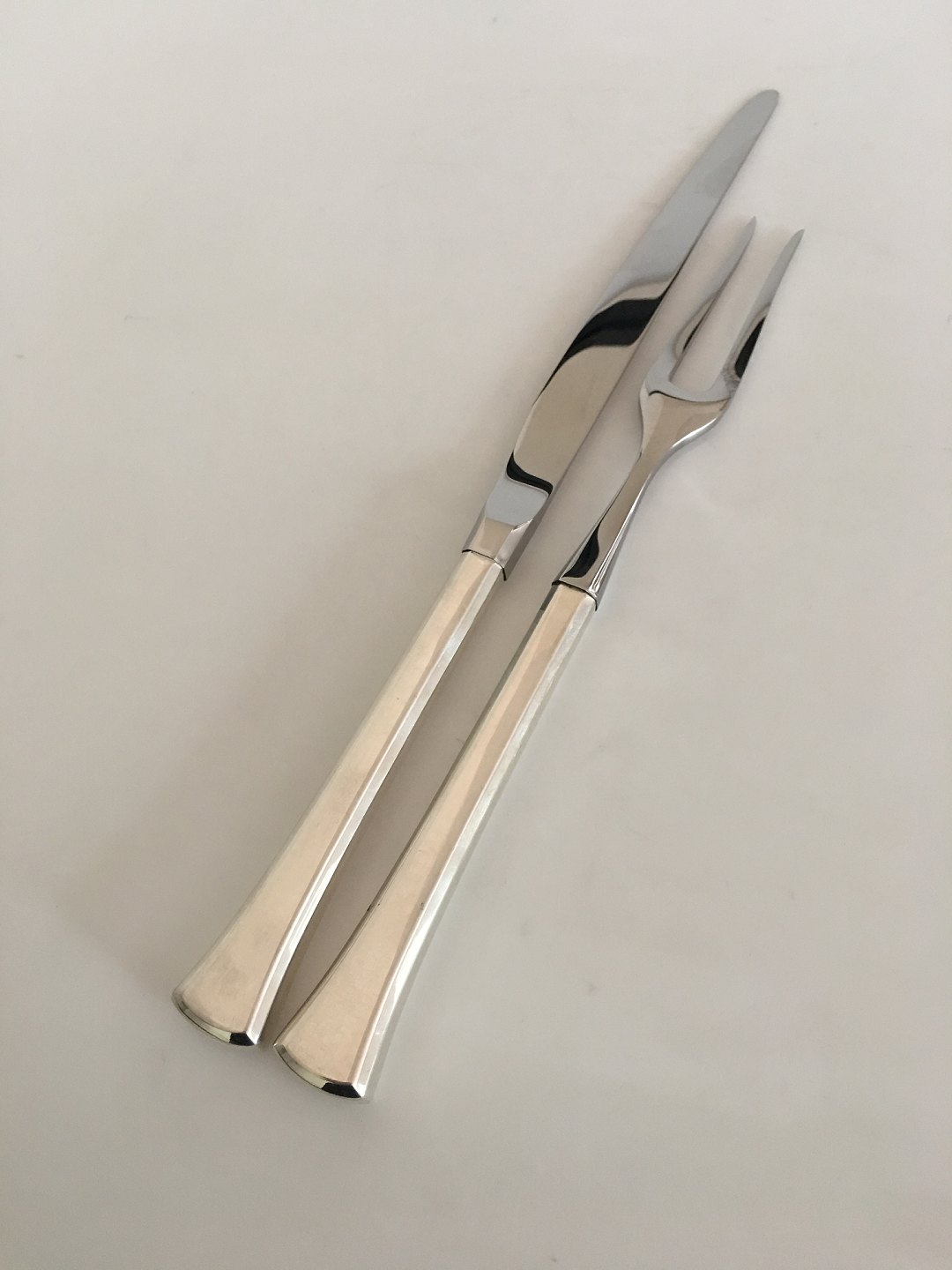 Hans Hansen Kristine Carving Set Fork and Knife in Sterling Silver and Stainless Steel. Measures 28 (11 1/32") and 33.5 cm L (13 3/16").