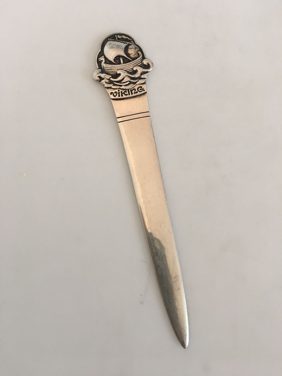 Evald Nielsen Silver Letter Opener with Viking Ornament. 15.3 cm L (6 1/32")