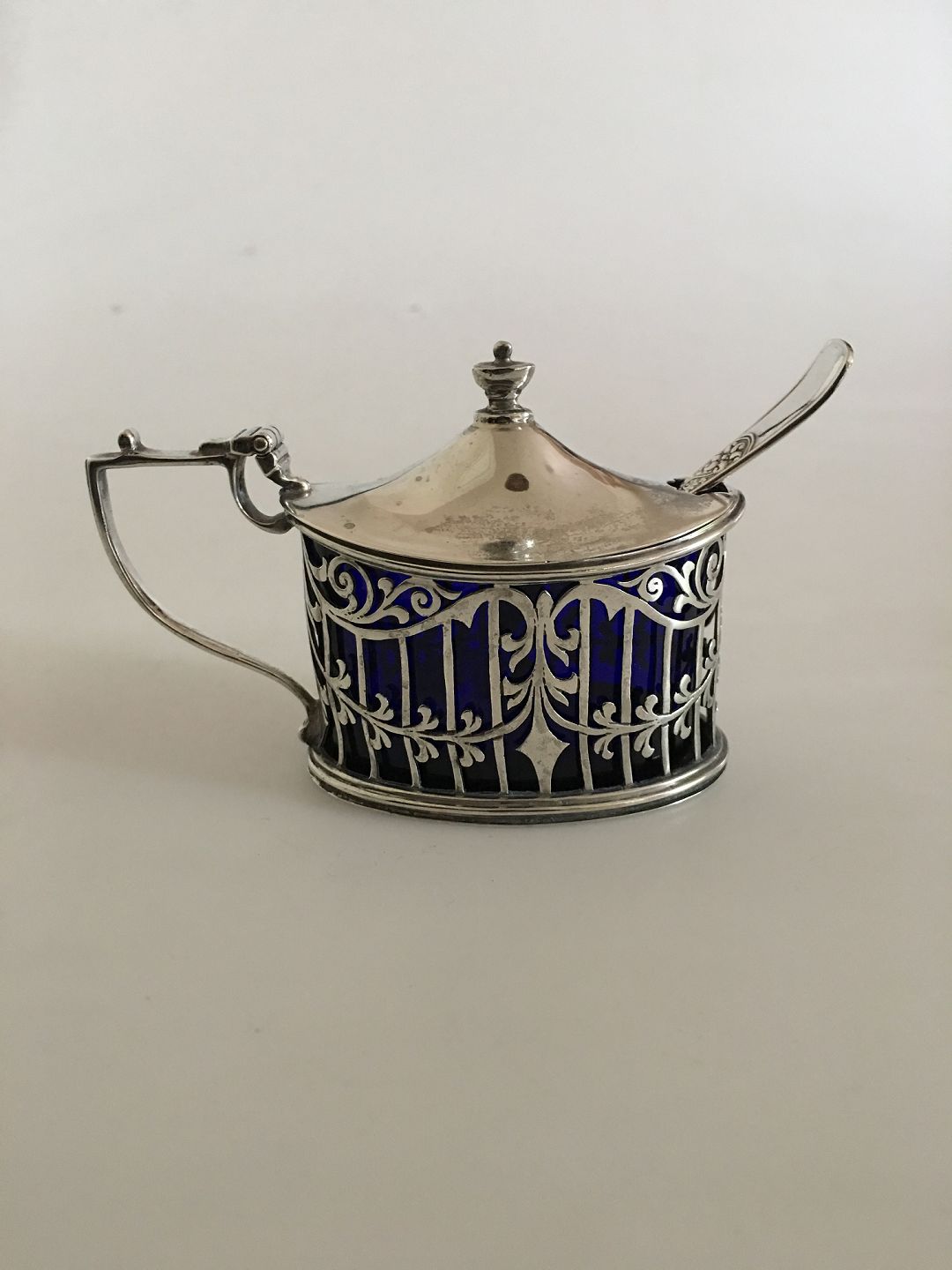 Birks Mustard pot in sterling silver with spoon in silverplate.