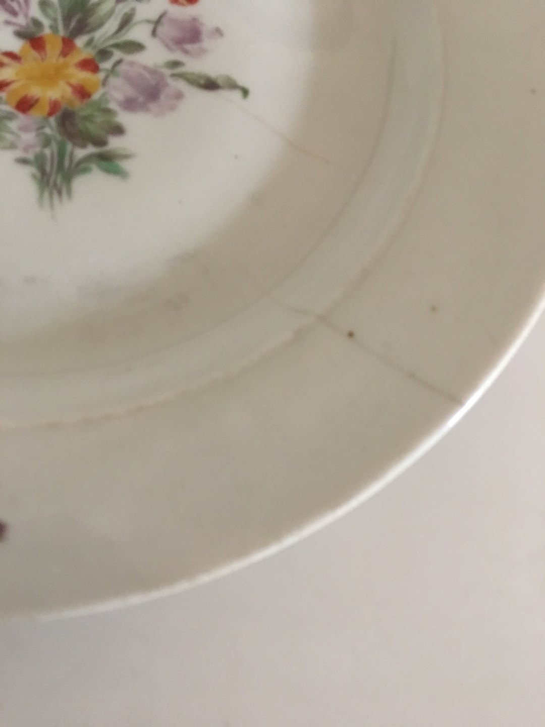 Antique Royal Copenhagen Plate with Flower Decoration 1790-1810. The porcelain is quite worn and tired looking, and most of the flower decoration is worn off. Two sizable hairstrokes across the plate. Measures 24.5 cm